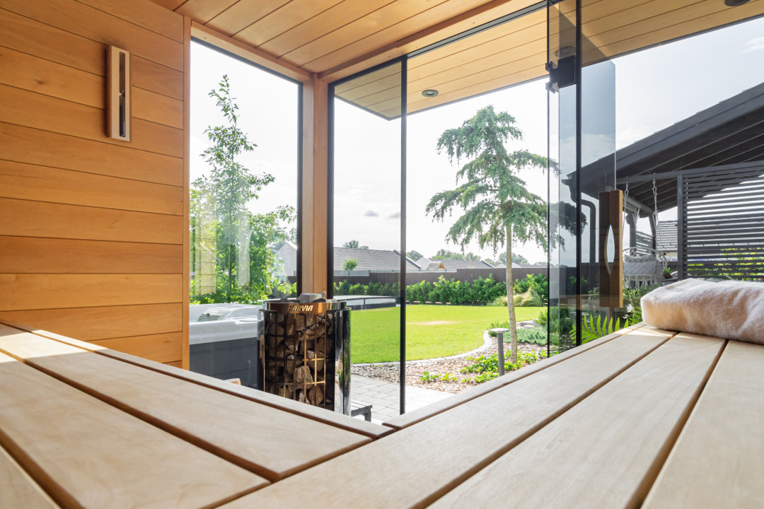 - Szauna 9 kW-os kályhával, amely thermo nyárfa ülőfelületeivel biztonságosan és komfortosan használható. A kristálytiszta hangzású zen dallamok és a kertre nyíló panoráma különleges relaxációt biztosítanak.