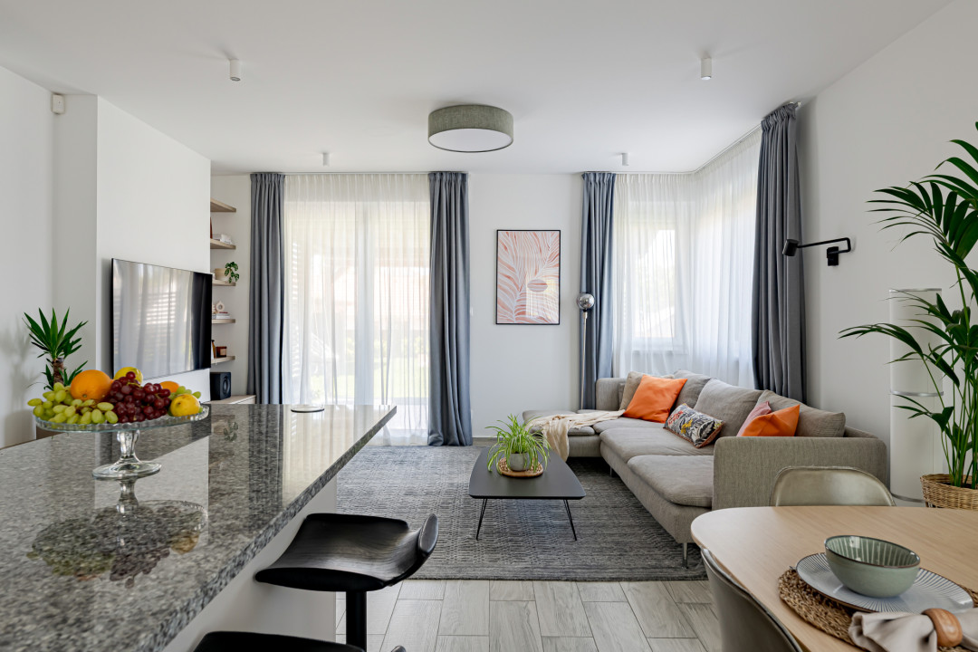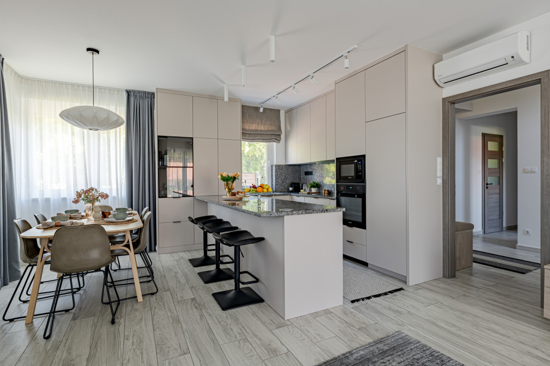 - Amerikai konyhás nappali: prémium gránit konyhapult, víztisztítós csaptelep, minőségi beépített gépek (sütő, indukciós főzőlap, mikrohullámú sütő, mosogatógép, hűtő, borhűtő).