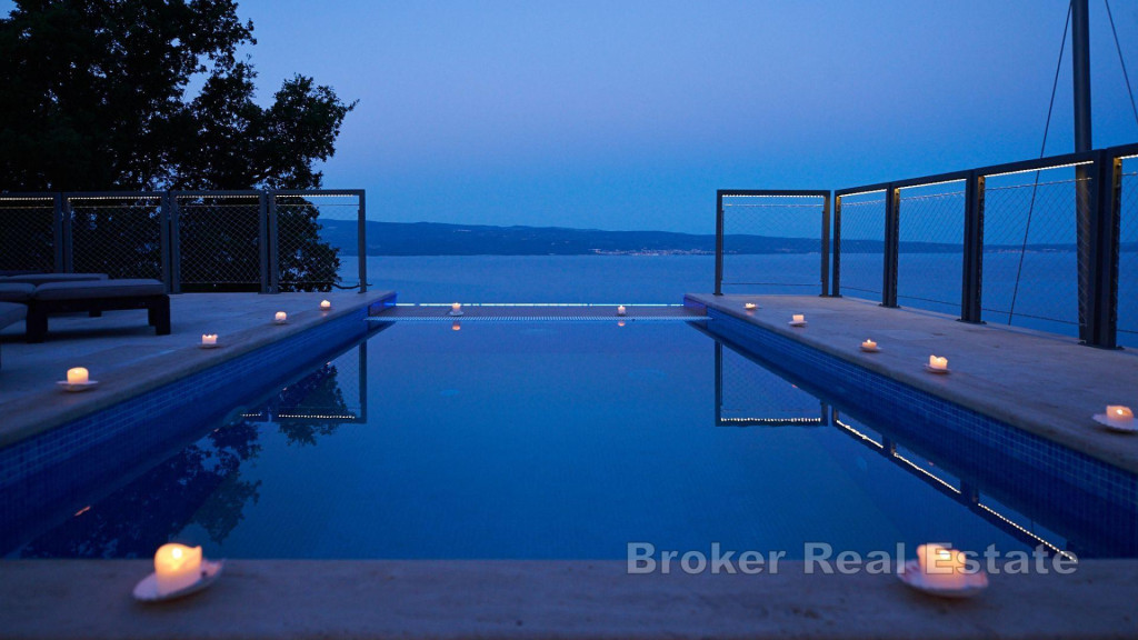 A Splittől 18, Omistól 10 km-re fekvő csendes üdülővárosban, Jesenicében található ez a tengerre panorámás villa, melynek környezetében érintetlen partszakaszokat fedezhetünk fel. Az ingatlan 4 szintes, a nappali-étkező-konyha egy nyitott térben helyezkedik el, találhatunk még a házban 4 hálószobát, mindegyiket saját fürdőszobával, egy vendég WC-t, egy wellness helyiséget szaunával és fitneszteremmel. A nappaliból léphetünk ki a tengerre panorámás teraszra, ahol találjuk a medencét, egy napozó teraszt, egy nyári konyhát grillezővel és a kertet. Az ingatlanhoz tartozik egy mezőgazdasági terület is, éppen a ház alatt.