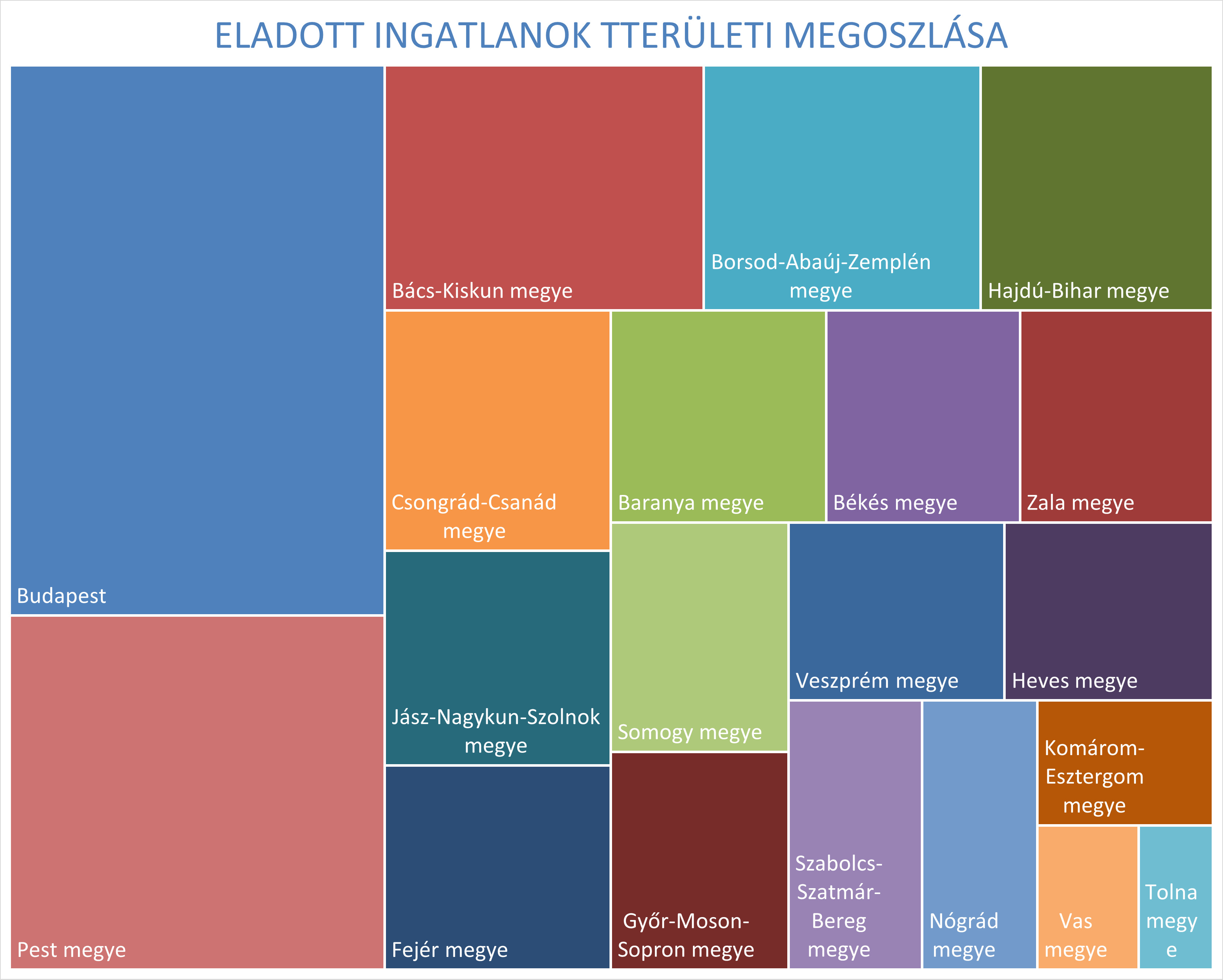 Az alábbi grafikon azt mutatja, hol mennyi ingatlan tűnt el a piacról. Minél nagyobb egy négyzet/téglalap, annál több ház vagy lakás kelt el az adott megyében.