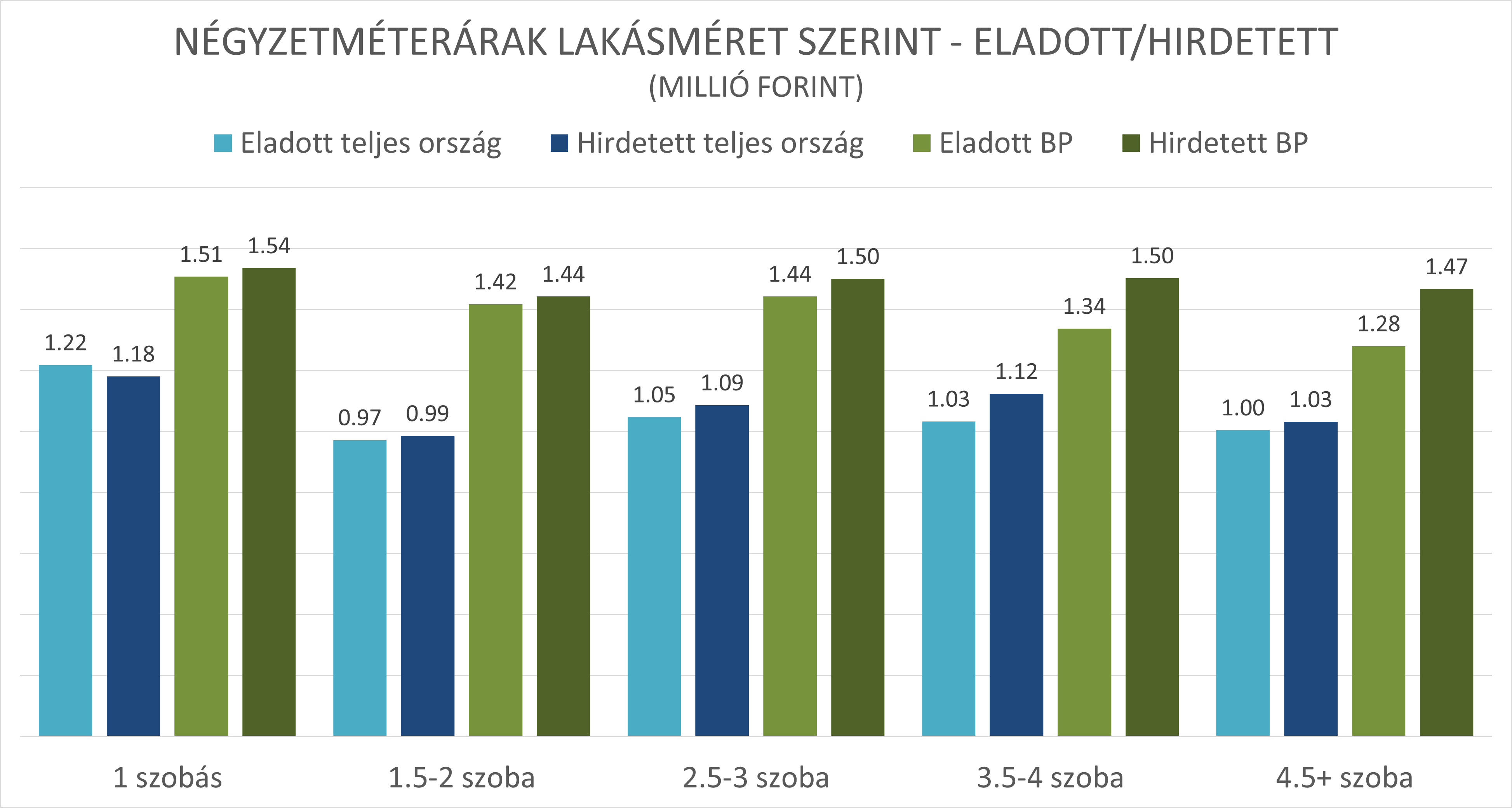 Ami viszont meglepő, hogy mégiscsak mutatkozik egy olyan tényező, ami befolyásolja az árszakadék méretét, ez pedig a lakásméret. Míg a garzonok és az egy hálószobás lakások esetében a kínálati és az eladott árak szinte egyformák, a 3 hálószobás és pláne annál nagyobb lakások piacán jócskán van tér az alkura - Budapesten.