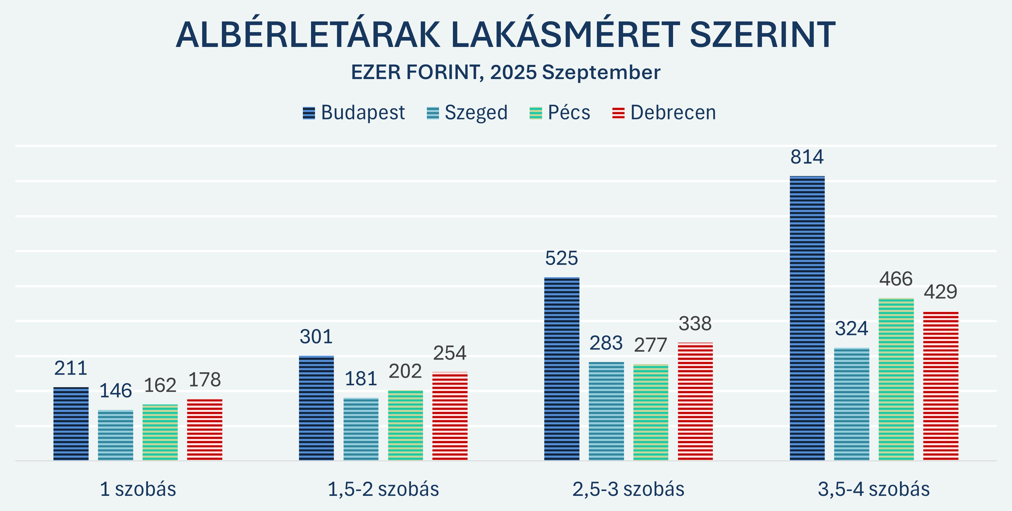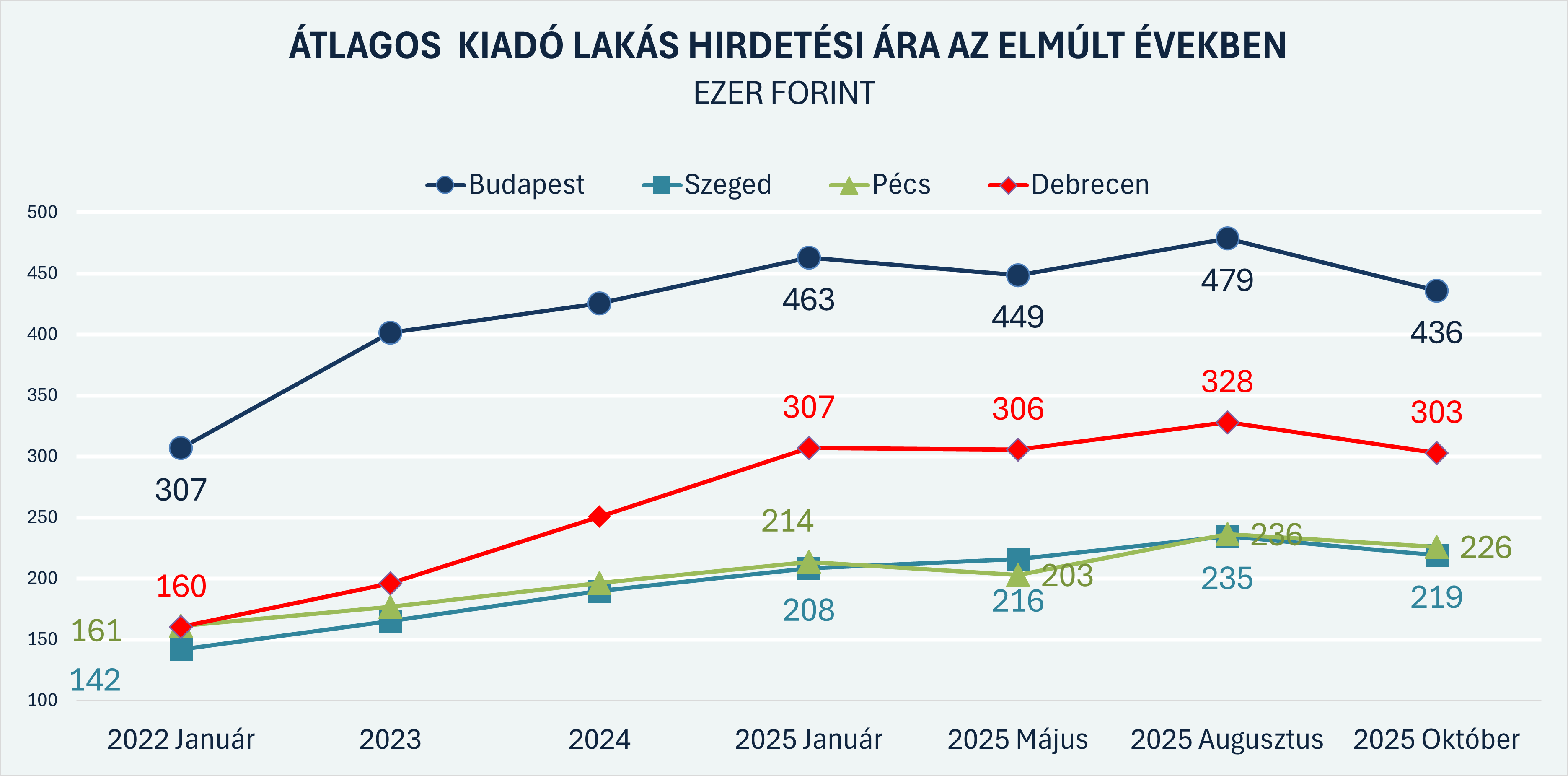 Az egyetemi városokban is hasonló tendenciák látszanak. Debrecenben a nyári, 328 ezres átlag után 303 ezer forintra estek a hirdetési árak, gyakorlatilag eltűnt az év első felében felhalmozott drágulás. Pécsen és Szegeden ezzel szemben kisebb ingadozások figyelhetők meg, de a növekedés itt is megállni látszik: az árak 220–230 ezer forint körül stabilizálódtak.