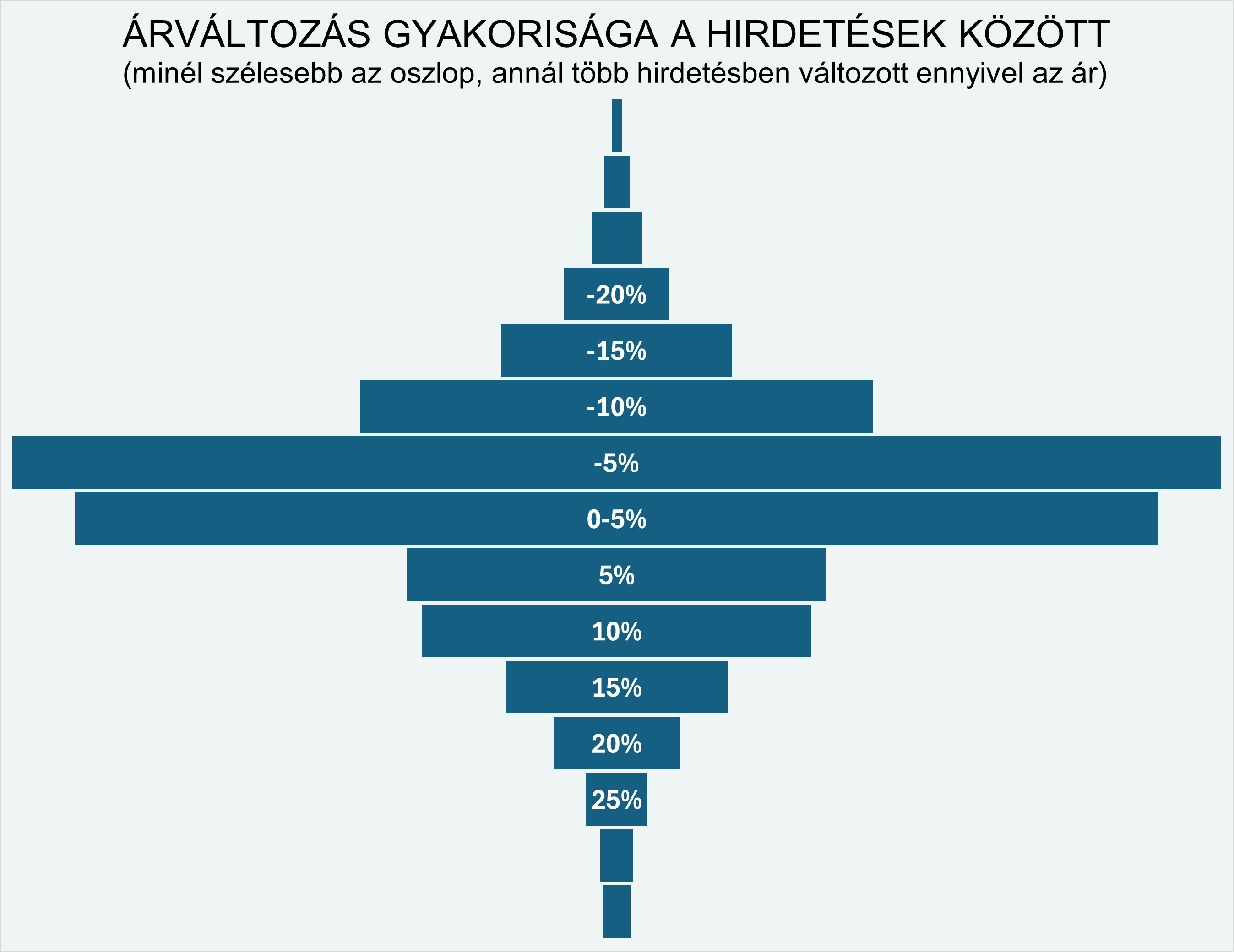 A grafikon jól mutatja a hangulatváltást: a korábbi, enyhén pozitív eloszlás helyét egy szimmetrikusabb, de negatív irányba tolódó eloszlás vette át. A piac persze nem omlott össze, inkább csak finoman lejtmenetbe kapcsolt – a hirdetők többsége kisebb lépésekben, de folyamatosan igazítja lefelé az árat, hogy a vevők radarján maradjon.