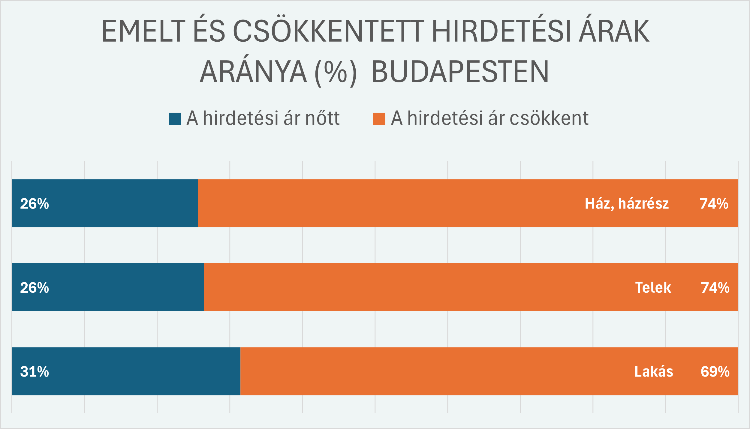 Ha külön a fővárost és az ország egészét nézzük, kiderül, hogy Budapesten jóval kisebb a szélsőség. A lakásoknál a hirdetések 69 százalékában csökkent, 31 százalékában viszont emelkedett az ár – vagyis a piac itt még mindig kiegyensúlyozottabb, mint országosan. A házak és telkek esetében viszont már négyből három hirdető lefelé ment az árakkal.
