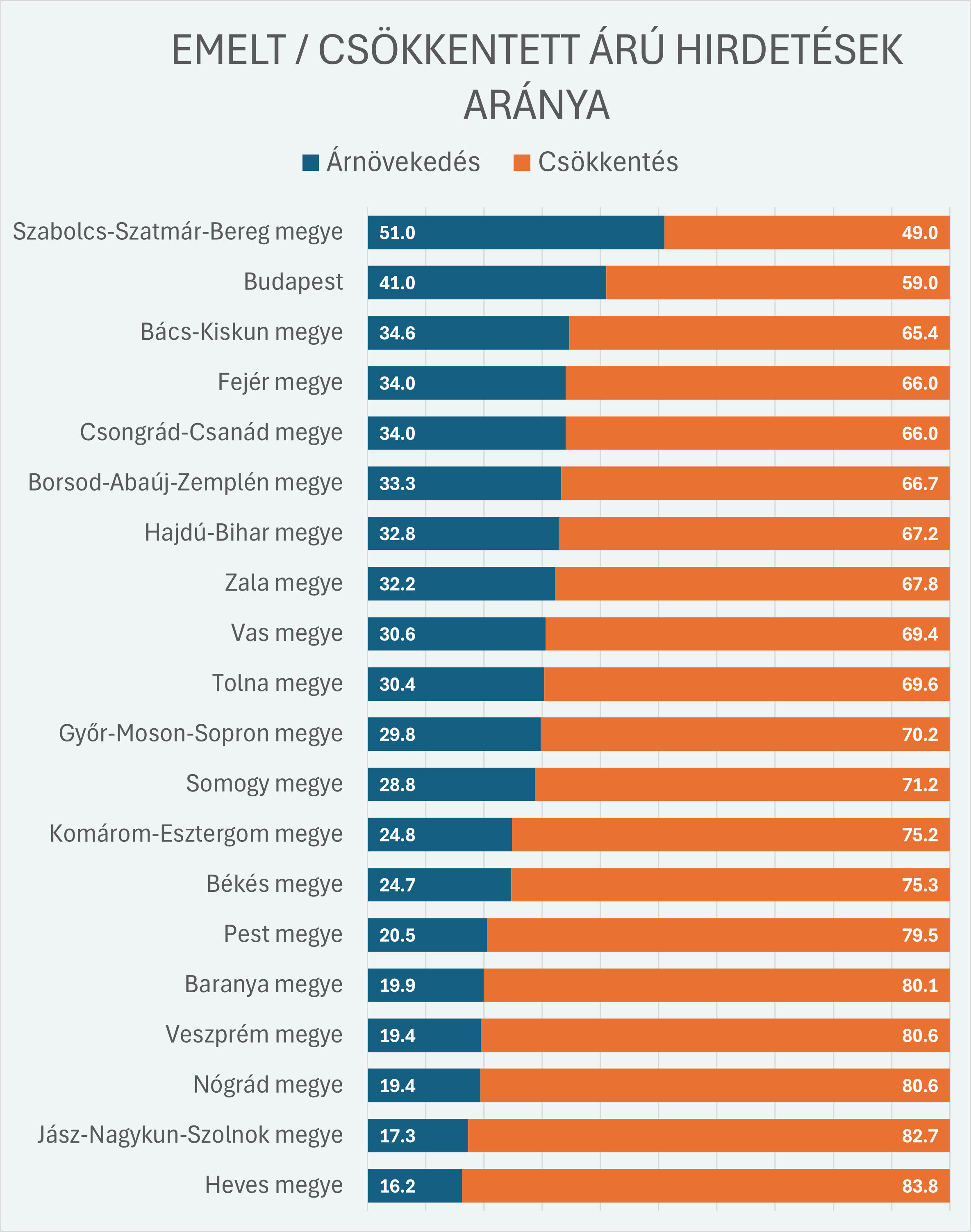 Ha megyei bontásban nézzük az árváltozásokat, árnyaltabb képet kapunk, mint amit az országos átlag mutat. Az elmúlt fél évben nem mindenhol ugyanabba az irányba mozdult a piac: miközben sok térségben nőtt az árcsökkentések aránya, néhány megyében és a fővárosban épp ellenkező folyamat látszik.Budapesten például enyhe pozitív fordulat történt – az áremelést jelző hirdetések aránya 38,8-ről 41 százalékra nőtt. Hasonló irányban mozdult el Fejér, Vas, Zala, Tolna és Békés megye is: ezekben a térségekben néhány százalékponttal nőtt az áremelők aránya, ami részben a helyi kereslet élénkülésére, részben a kínálat szűkülésére vezethető vissza.