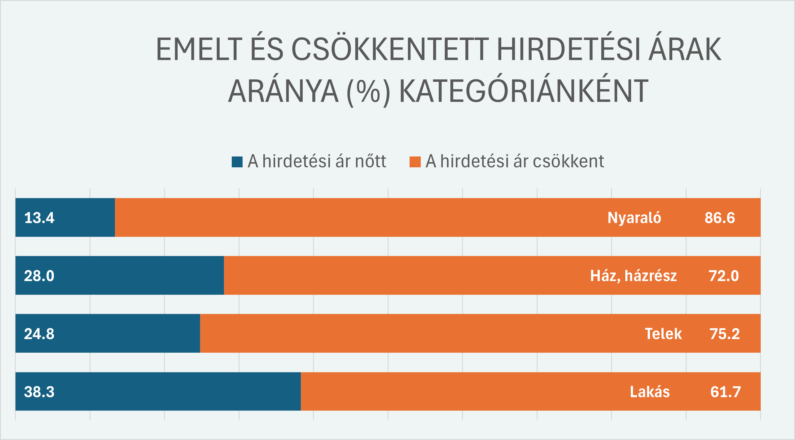 Országos szinten ennél erősebb a kontraszt: míg a lakásoknál a hirdetők 38 százaléka emelt, a nyaralók esetében ez csupán 13 százalék, míg az eladók 87 százaléka inkább engedett a hirdetési árból.
