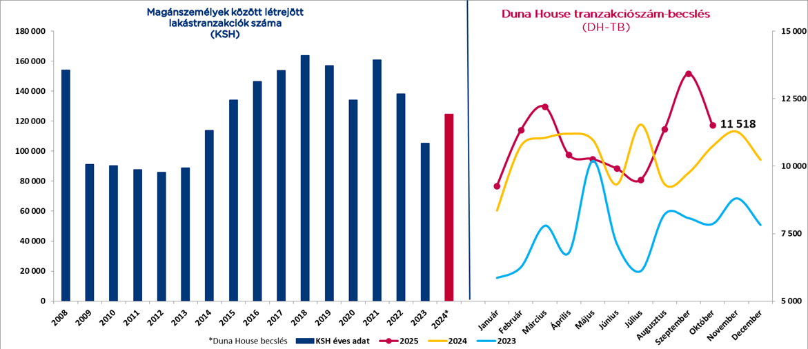 A Duna House 2025. októberi tranzakciószám-becslése (DH-TB) szerint 11 518 lakóingatlan cserélt gazdát Magyarországon. Ez 7,3%-kal több, mint egy évvel korábban, de 14,2%-kal kevesebb, mint a szeptemberi csúcs.