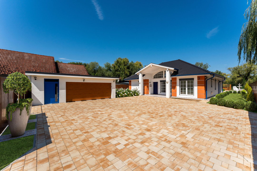 A kertben található 8×4 méteres, gépesített medence a nyári napok központi eleme, míg a kényelmes parkolást kétállásos garázs és tágas tároló biztosítja.