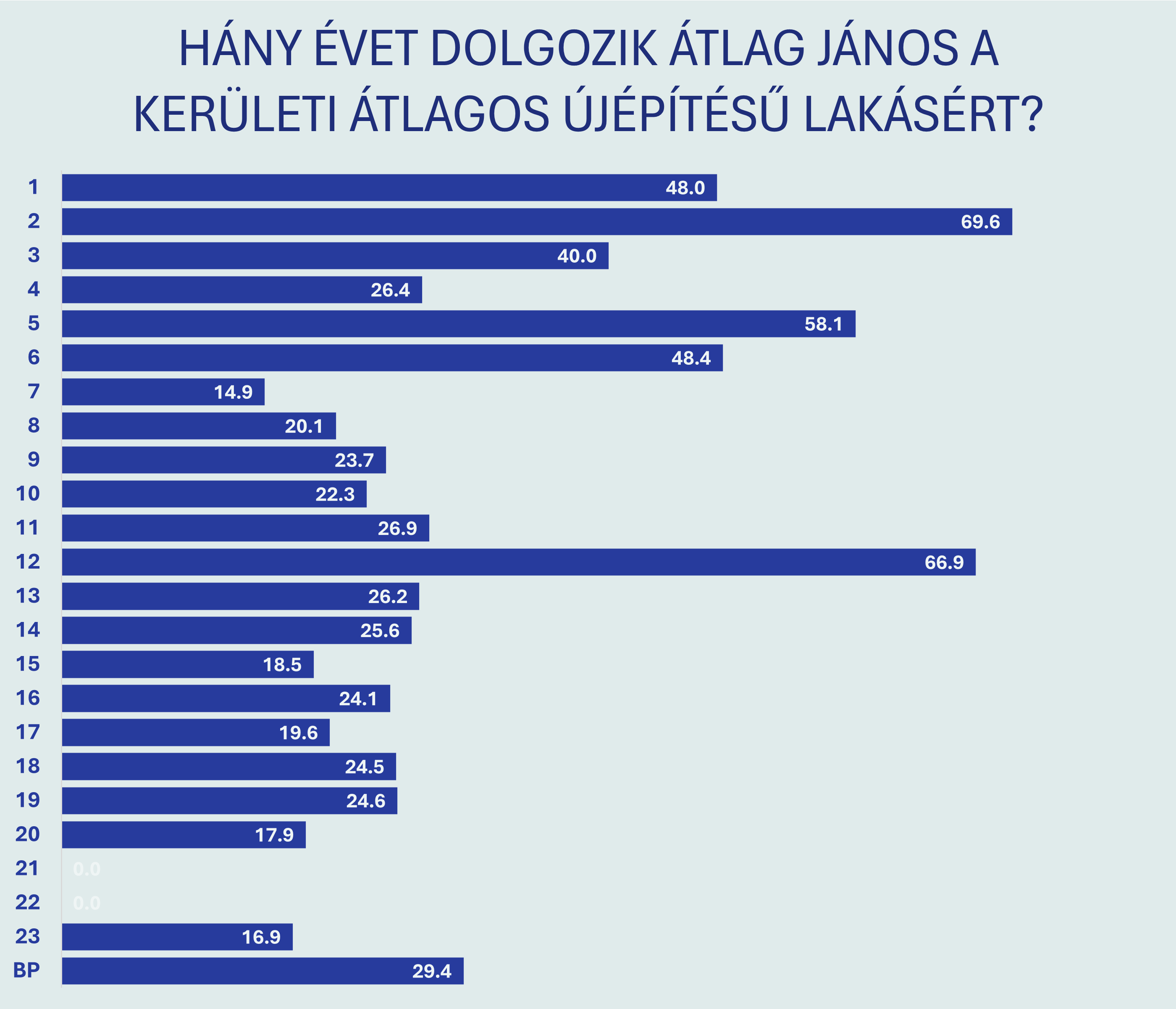 Ha a tényleges jövedelmeket vetjük össze az újépítésű lakások áraival, az eredmény kijózanító. Egy átlagkeresetből élő vásárlónak nagyjából 29 évnyi teljes bérjövedelemre lenne szüksége egy új lakás megvásárlásához – adózás, megélhetés és minden más kiadás nélkül. Az alábbi grafikon képzeletbeli honfitársunk, Átlag János esélyeit mutatja az újépítésű piacon. A számításhoz azt feltételeztük, hogy János a teljes nettó fizetését félre tudja tenni, és hogy jövedelme pont “közepes” a magyar társadalomban, az emberek fele jobban, másik fele rosszabbul keres, mint kitalált barátunk.A különbségek itt is hatalmasak: míg a VII. vagy XX. kerületben még „csupán” 15–18 évnyi munkával lenne elérhető egy új lakás, addig a II., XII. vagy I. kerületben már 50–70 évnyi jövedelem sem lenne elég.