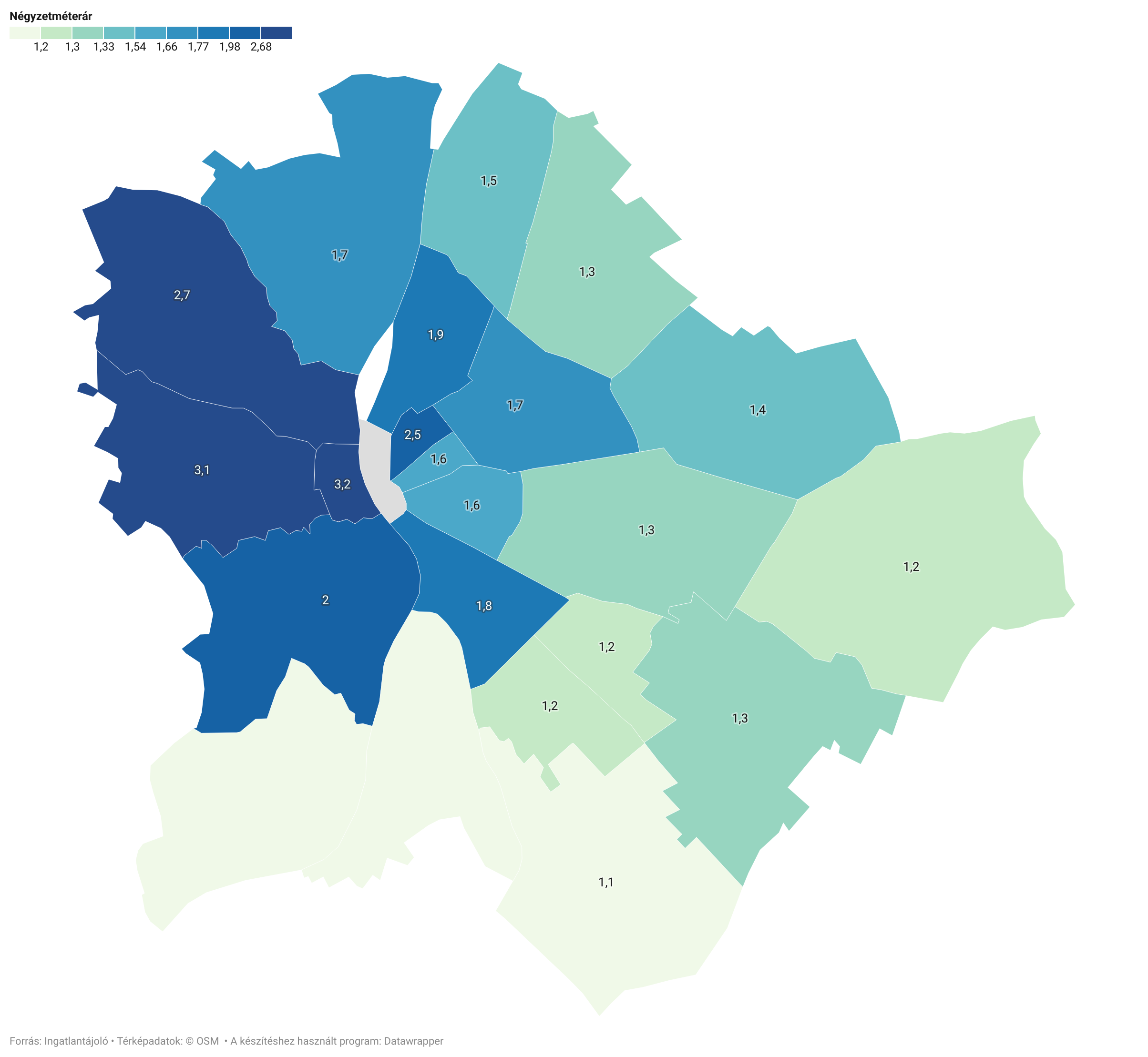 A kerületek közötti különbségek továbbra is jól kirajzolódnak: Budán az átlagos négyzetméterár 2–3 millió forint között mozog, a legdrágább a II., XI. és XII. kerület. A belvárosi zónában (V., VI., VII., IX.) is jellemzően 1,6–2,5 millió forint között alakulnak az árak, míg a külső pesti kerületekben továbbra is jóval megfizethetőbb az újépítésű kínálat: több helyen 1,1–1,3 millió forint körül indulnak a négyzetméterárak.