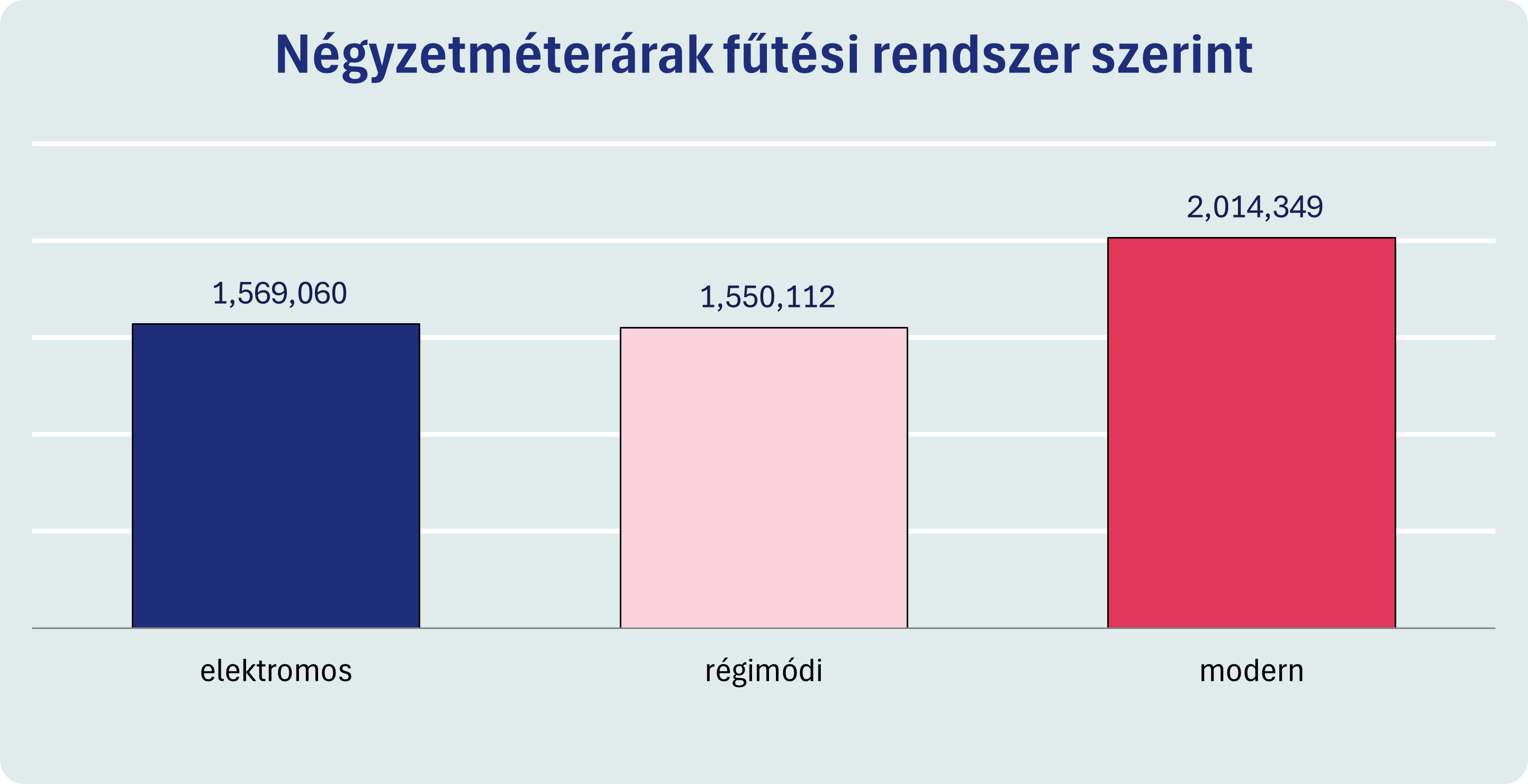 Ha az árakat a fűtési rendszerek alapján bontjuk, kiderül, hogy valóban erősen polarizálódott a piac: a modern, energiahatékony megoldásokkal épülő lakások átlagosan félmillió forinttal drágábbak négyzetméterenként, mint a hagyományos gázkazános vagy elektromos fűtésűek.