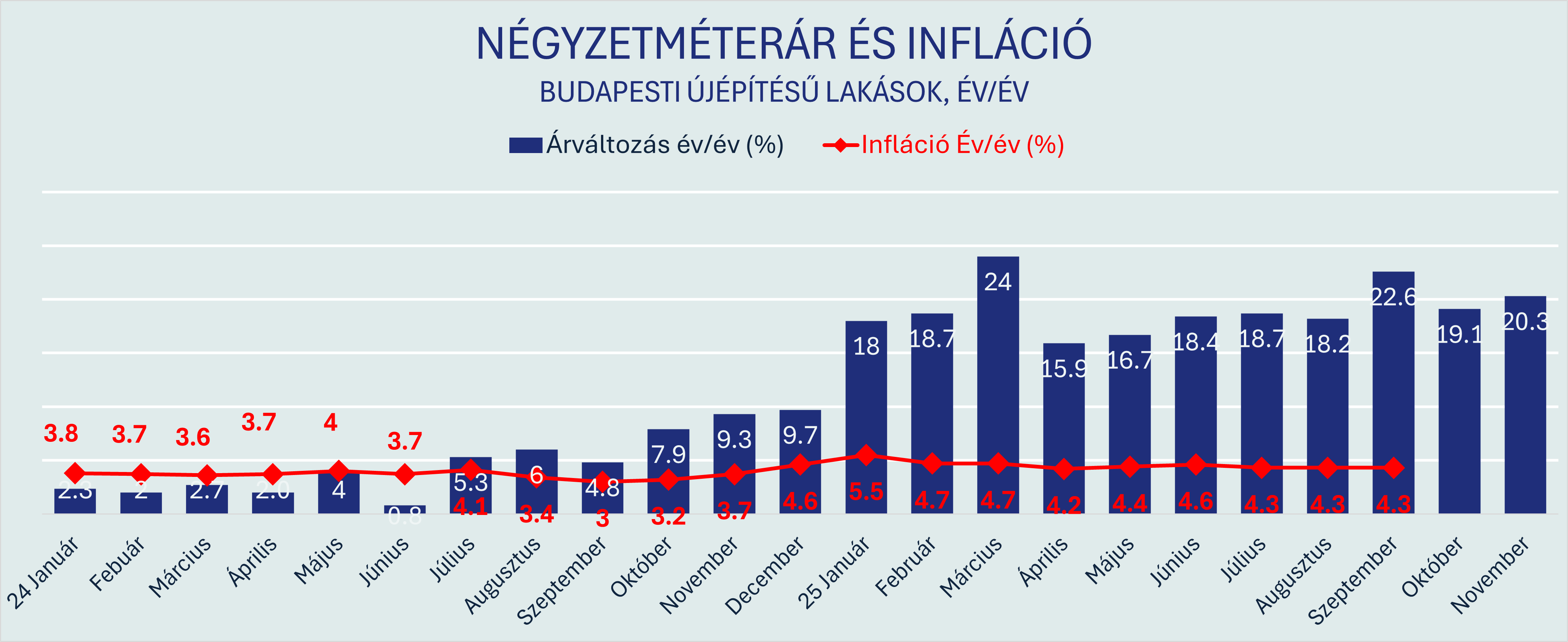 A budapesti újépítésű lakások négyzetméterára novemberben közel 20 százalékkal volt magasabb, mint egy évvel korábban, miközben az éves infláció valamivel 4 százalék fölött volt. Az, hogy az új lakások drágulása többszörösen meghaladja az általános áremelkedést, már aligha magyarázható pusztán az építőipari költségek vagy a munkaerőhiány hatásával. Sokkal inkább arról van szó, hogy a szűkülő kínálat és a kormányzati hitelígéretek együtt torzítják a piacot.