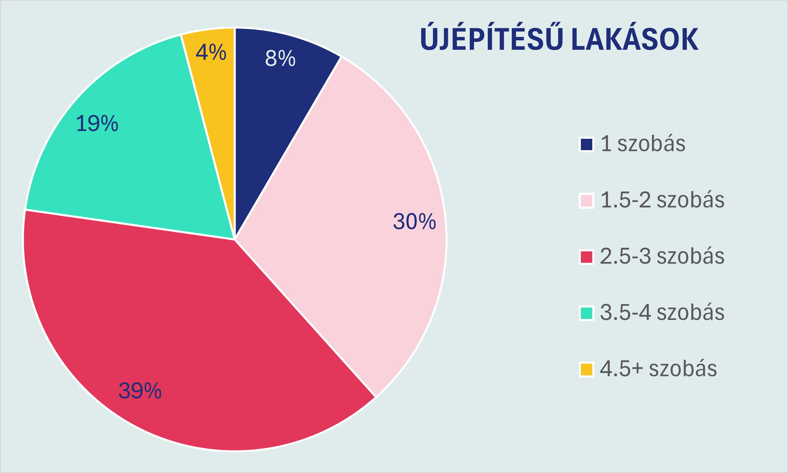 A hirdetések alapján a piac szerkezete is átalakult. Az új építésű kínálat közel kétharmada legalább kétszobás lakás, miközben az egyszobások aránya mindössze 8 százalék. Ez önmagában is hozzájárul az átlagárak emelkedéséhez, hiszen a nagyobb alapterületű, drágább ingatlanok felé tolódik a piac.