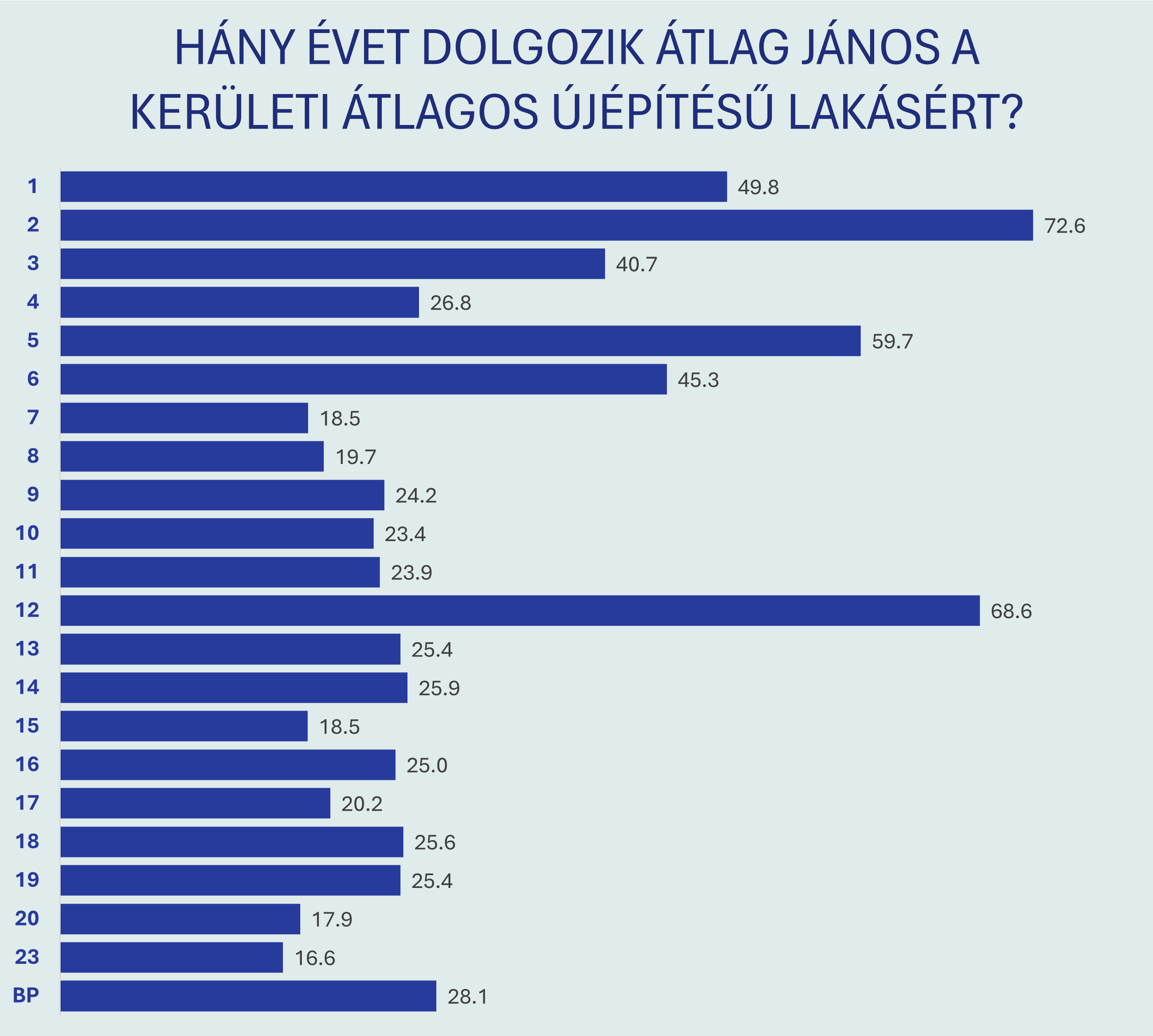 A kerületek között óriási a szórás. A presztízs-kerületekben Jánosnak 50-70 évig kéne félretennie minden fillér nettó bérét, mire meg tud venni egy átlagos új lakást, míg a kevésbé felkapott lokációk esetében erre elég 20-25 év is. Átlag János a leghamarabb a VII. és a XV. kerületben talál új otthonra.