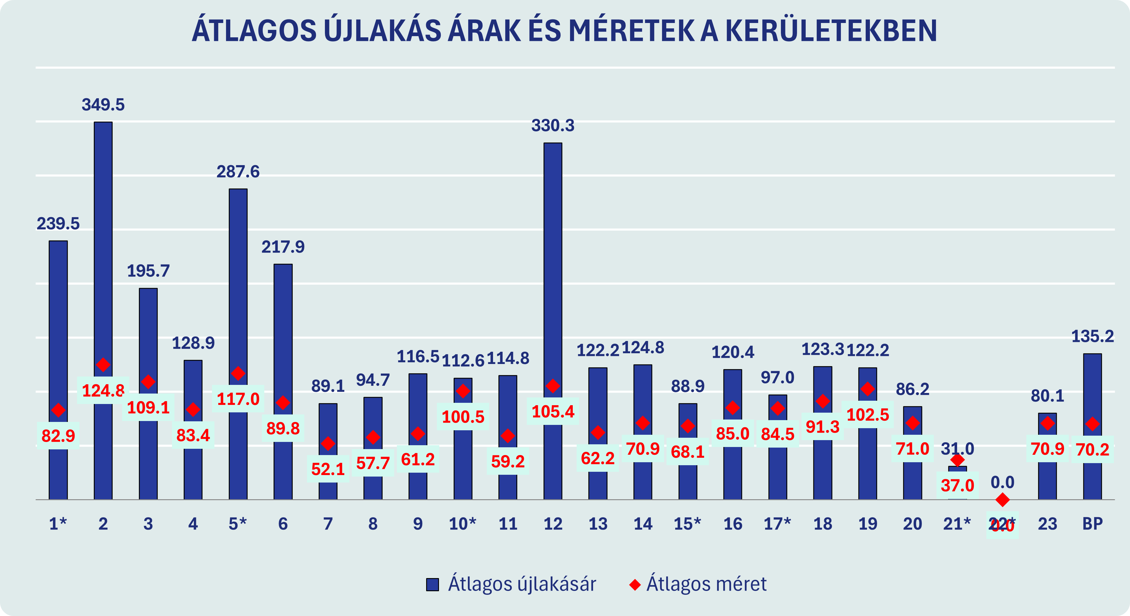 A kerületi adatok alapján jól látszik, hogy a legdrágább budapesti újépítésű piacokat nem elsősorban a kis alapterületű lakások húzzák, hanem épp ellenkezőleg: ezekben a városrészekben az átlagosnál - ami most 70.2 négyzetméter Budapesten - jóval nagyobb lakások épülnek.A II. kerületben az újépítésű lakások átlagos alapterülete közel 125 négyzetméter, ami itt 350 millió forint körüli átlagos új lakásárat jelent. Hasonló a helyzet a XII. kerületben is, ahol az átlagos méret 105 négyzetméter felett alakul, miközben az átlagos új lakás ára 330 millió forint körül mozog.