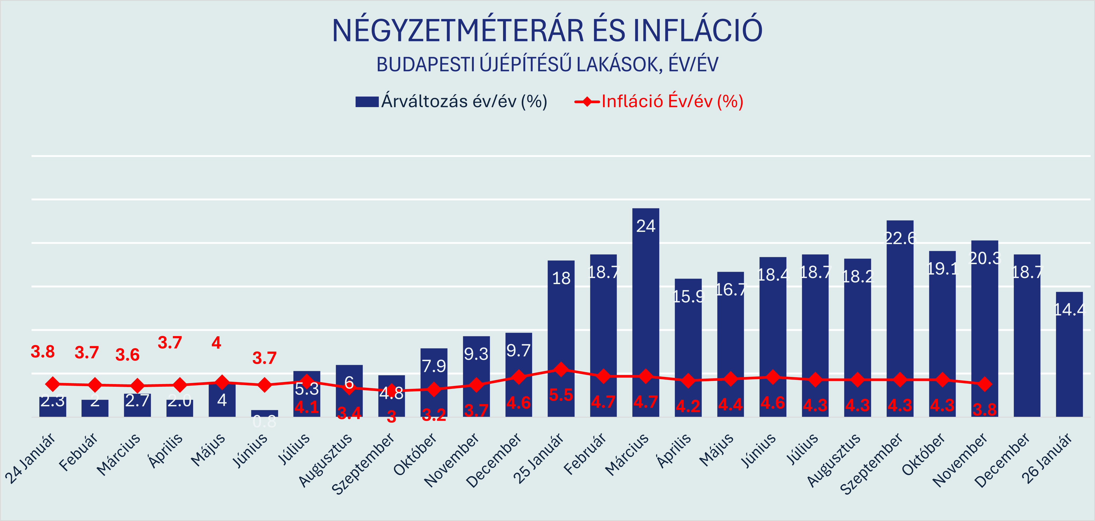 Az adatok alapján 2025-ben végleg kettészakadt az infláció és az újépítésű lakások árdinamikája. Miközben az infláció az év nagy részében már mérsékelt, 3-5 százalékos sávban mozgott, az újépítésű négyzetméterárak drágulása tartósan és látványosan efölött maradt, több hónapban is 20 százalék feletti éves növekedést mutatva.