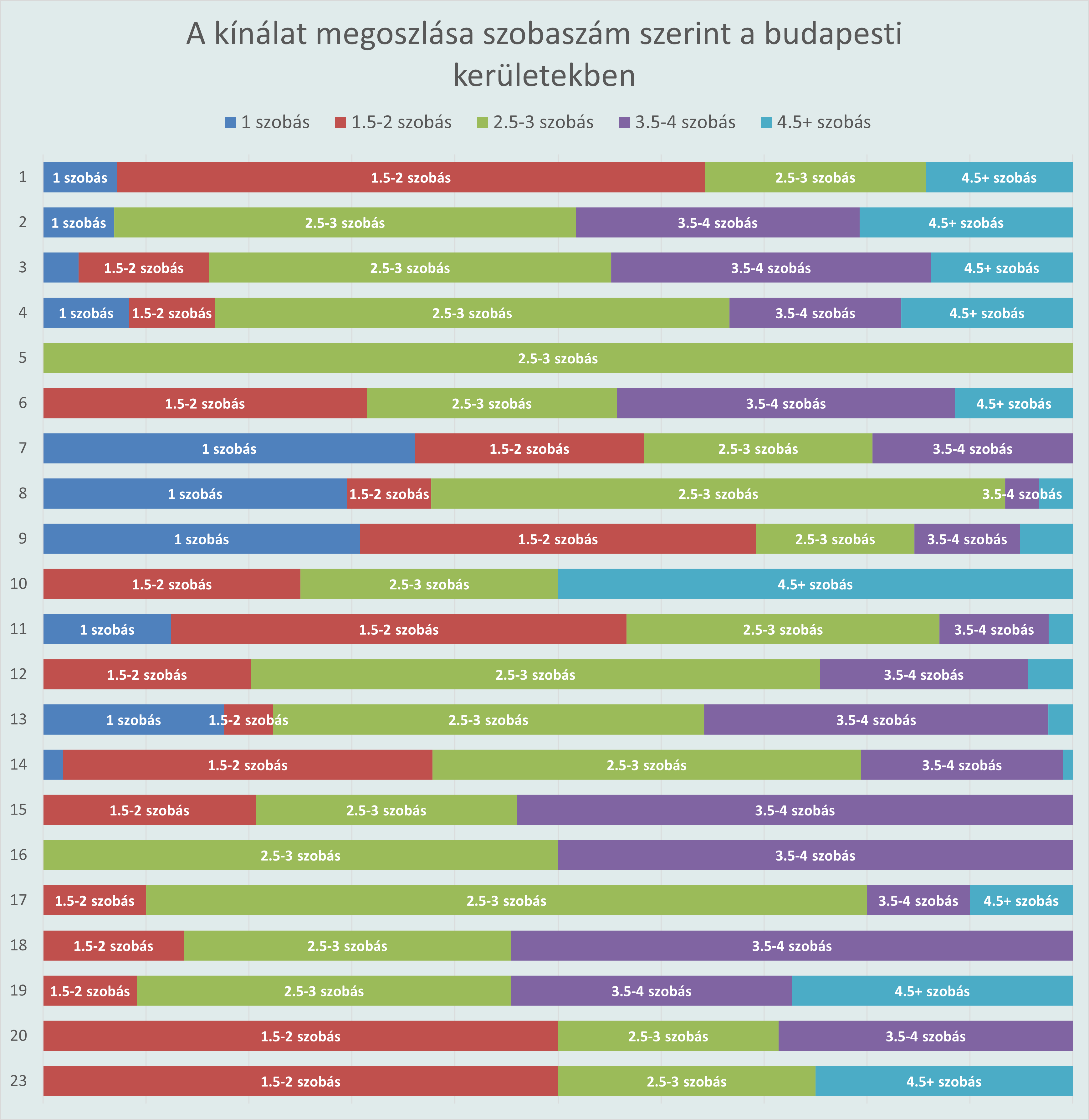 A legtöbb kerületben az egy- és két hálószobás lakások adják a kínálat gerincét, miközben az egyszobás és a valóban nagy, 4,5 szobás lakások aránya alacsony. A fejlesztők elsősorban a „családbarát, de még eladható” méretű lakásokra optimalizálnak.