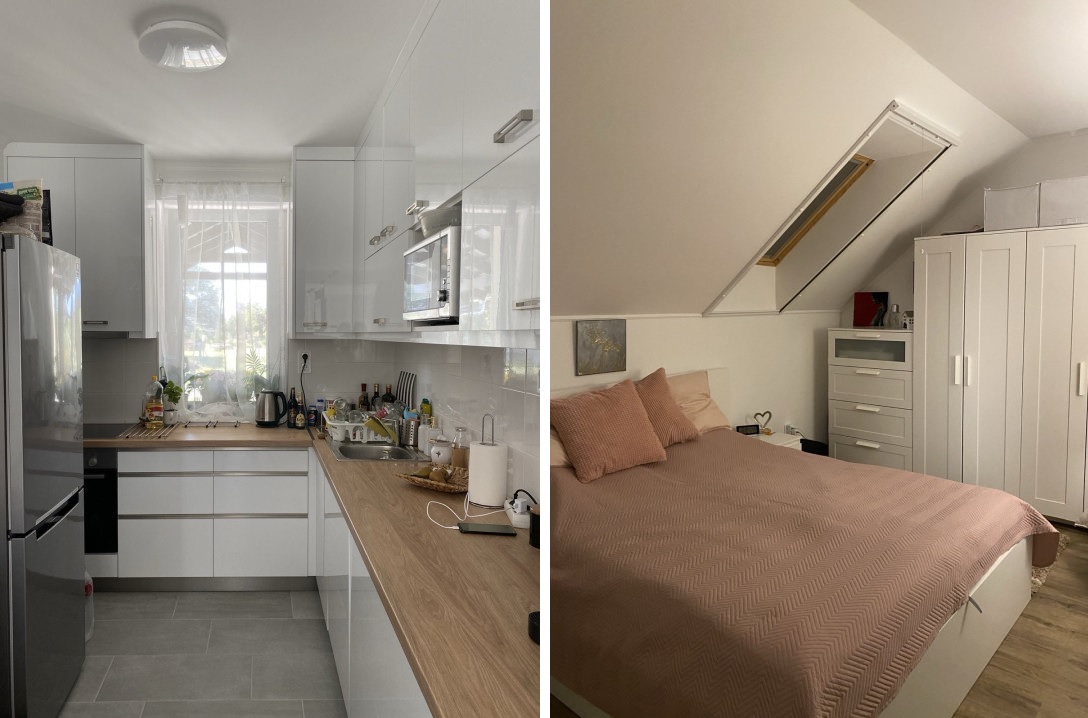 A tetőtér beépítéses ház elrendezése praktikus és élhető, amerikai konyhás nappali és két különálló szoba, egy félszoba, amely dolgozószobának vagy vendégszobának is ideális, mindkét szinten külön fürdőszoba, illetve egy előszoba alkotja egészét, melyben beépített gardróbszekrény is helyet kapott.