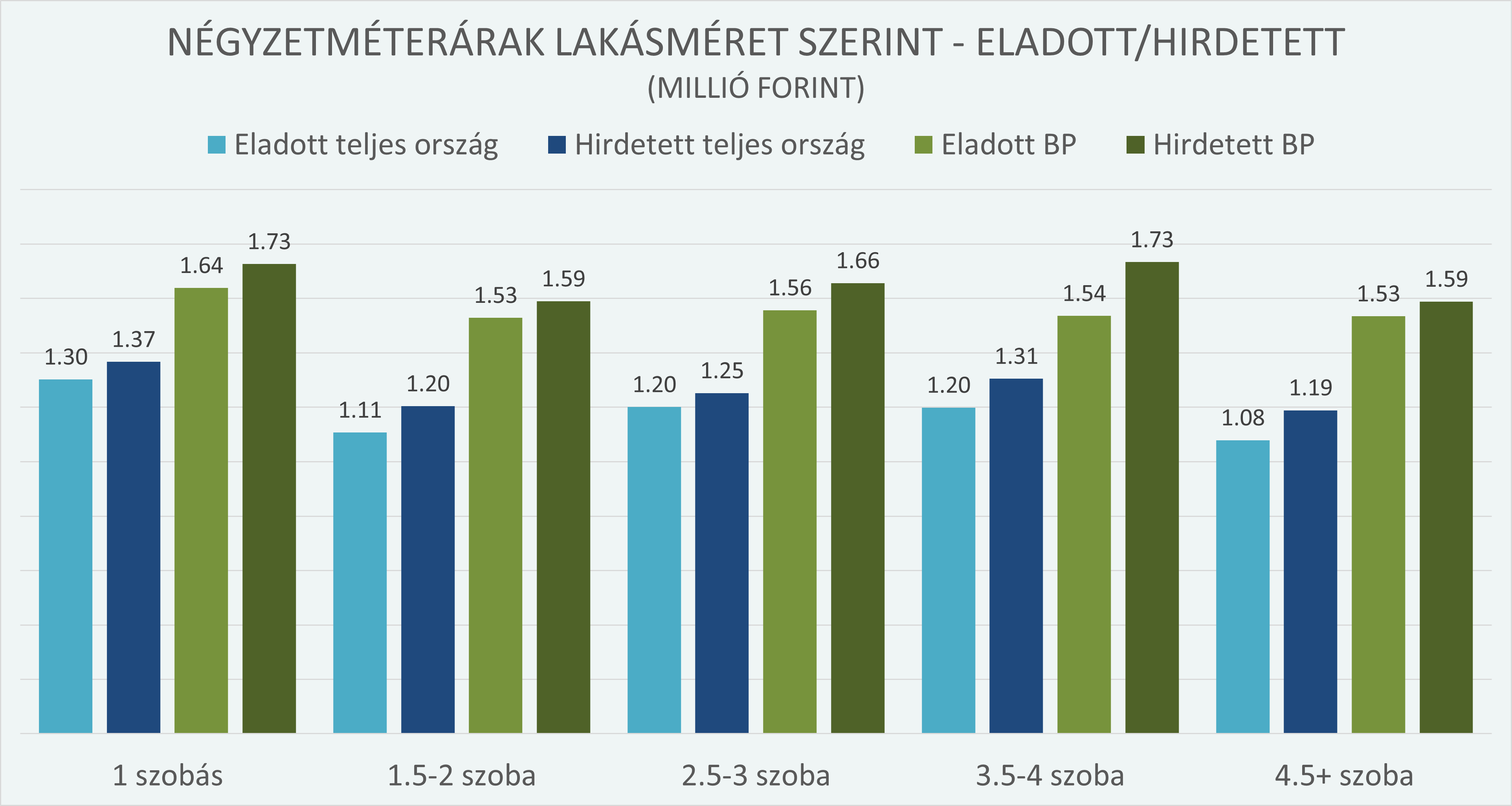 A 2026 februári adatok alapján egyértelmű mintázat rajzolódik ki: az eladott lakások négyzetméterára minden vizsgált méretkategóriában alacsonyabb, mint a teljes, aktuálisan hirdetett kínálat átlaga.Ez igaz országosan és Budapesten is, és az 1 szobás garzonoktól egészen a 4,5 szobánál nagyobb lakásokig következetesen megfigyelhető.