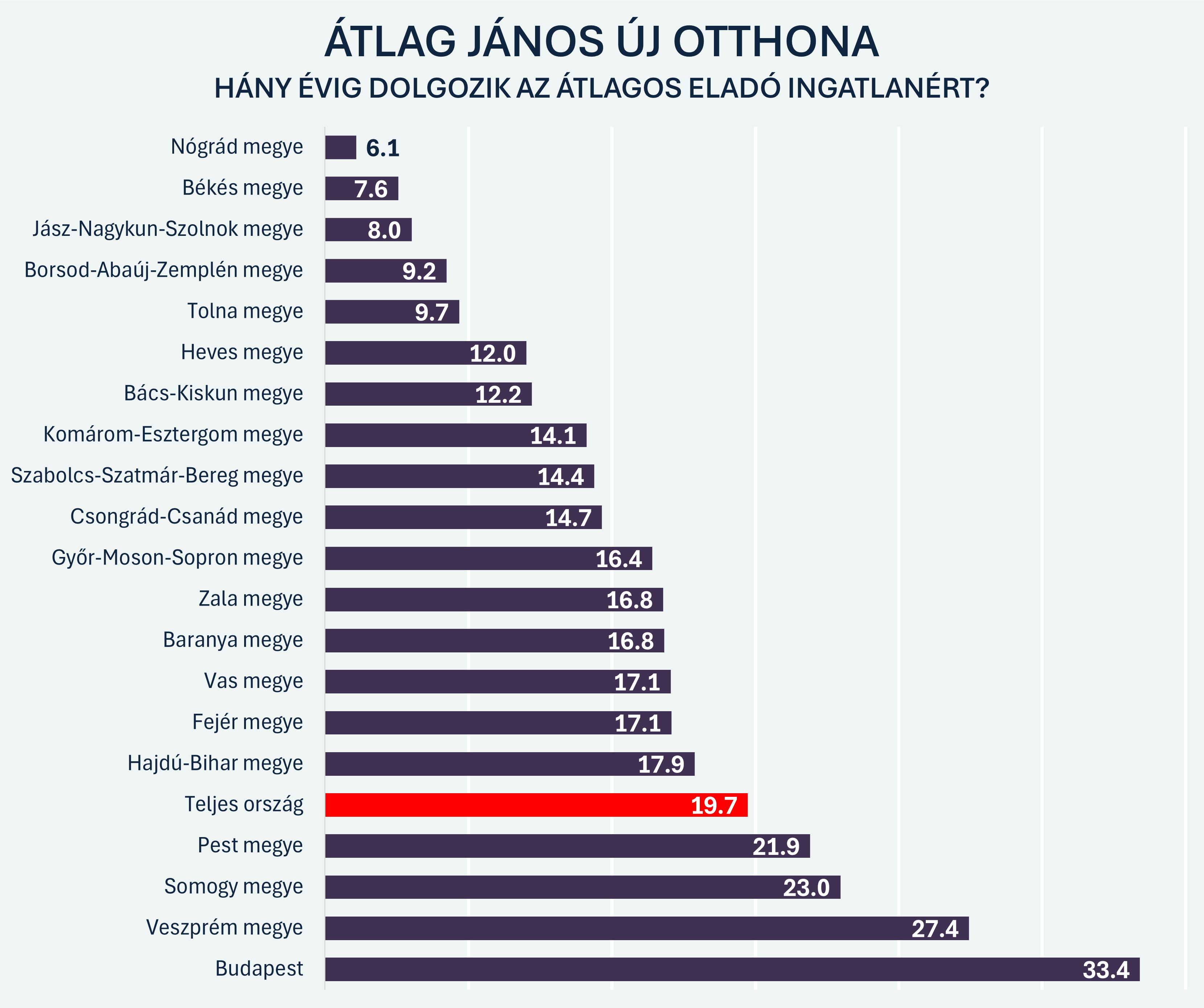 A lista végén azonban két kiugró érték áll: Veszprém megyében 27 év, Budapesten pedig több mint 33 évnyi nettó átlagjövedelem szükséges egy átlagos ingatlan megvásárlásához.