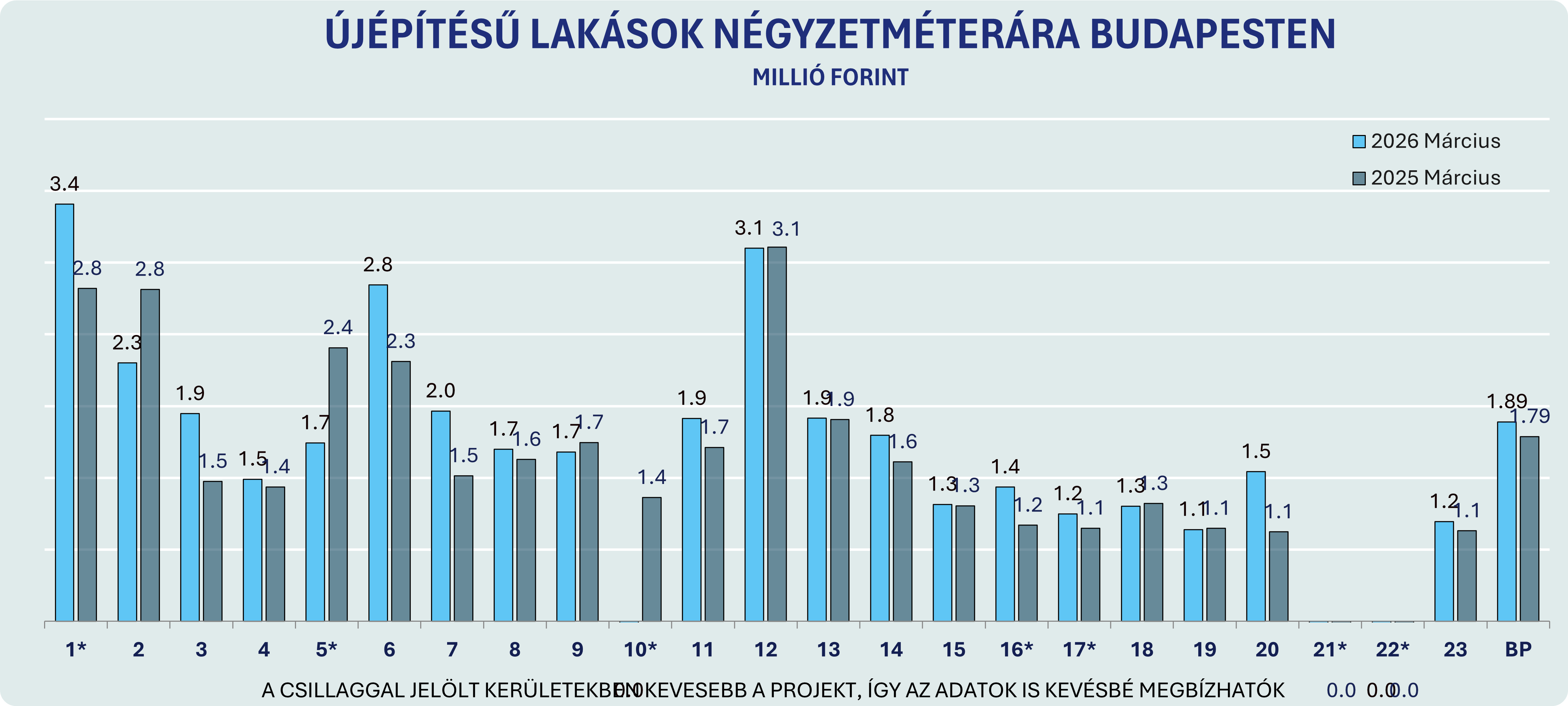 Az ilyen kerületi kilengéseket ugyanakkor mindig óvatosan érdemes értelmezni: az újépítésű piac sajátossága, hogy egy-egy nagyobb projekt megjelenése vagy eltűnése jelentősen elmozdíthatja az adott kerület átlagárát. A csillaggal jelölt kerületekben ráadásul kifejezetten kevés projekt szerepel az adatbázisban, ezért ezeknél az árak is nagyobb kilengést mutathatnak.