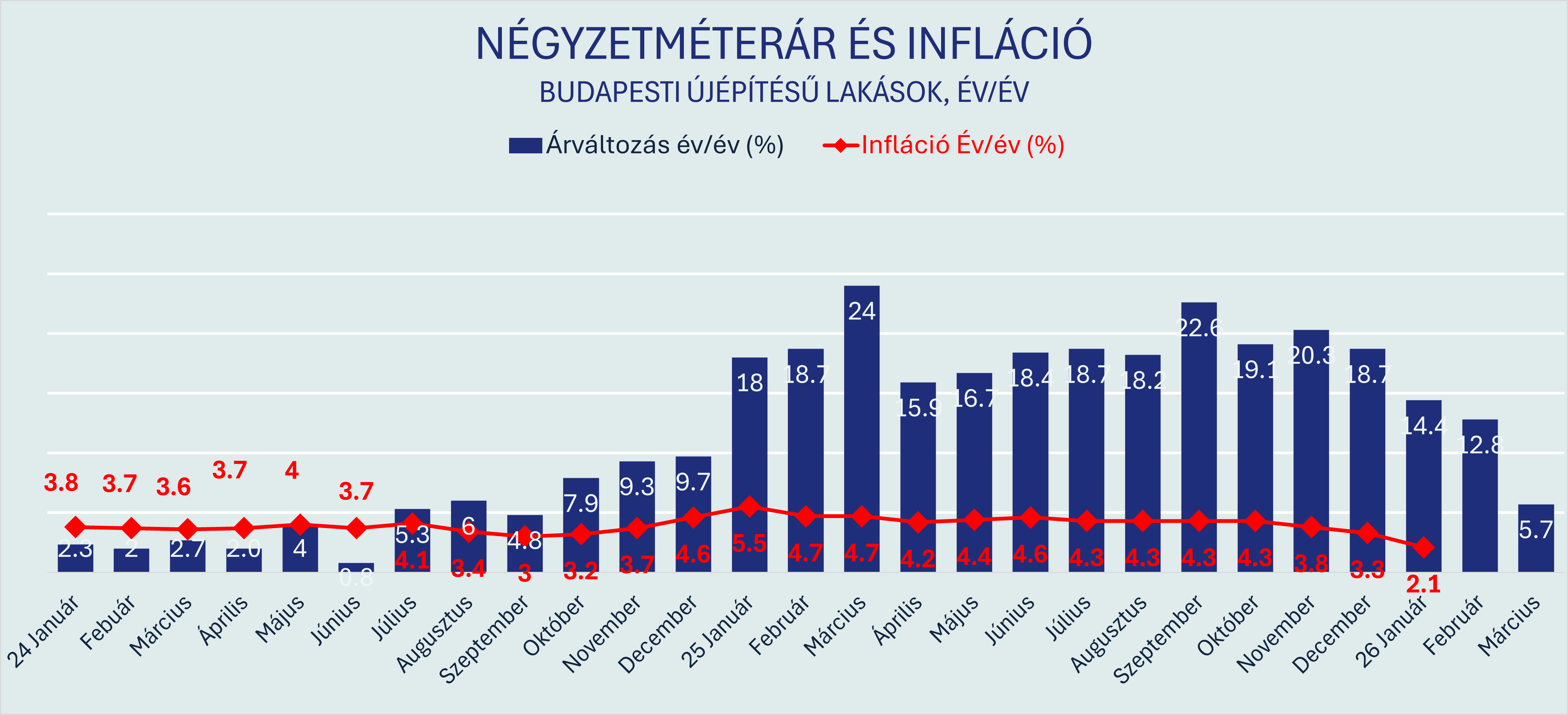 2025 nagy részében az új lakások ára jóval gyorsabban emelkedett, mint az általános árszint: több hónapban is 18–24 százalék közötti éves drágulást mérhettünk, miközben az infláció 4–5 százalék körül alakult.2026 elejére azonban jelentősen megváltozott a kép. Az éves árnövekedés üteme hónapról hónapra mérséklődött, és márciusra 5,7 százalékra lassult. Ha ezt összevetjük a KSH által publikált legutolsó (januári) inflációs adattal, látványos a reáldrágulás lassulása.