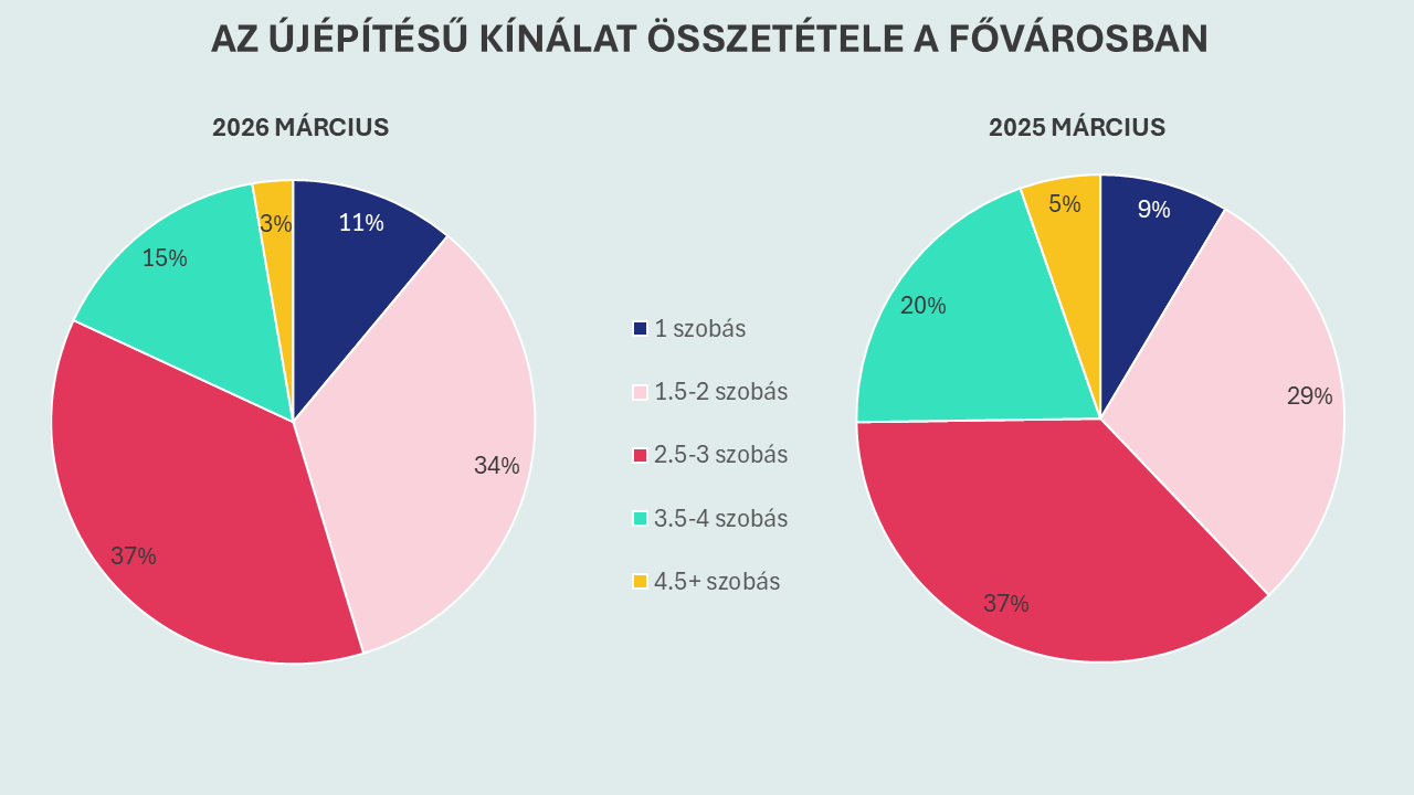 Az elmúlt évben a újépítésű lakások kínálatának összetétele is némi változást mutat.A kínálatból a legnagyobb részt tavaly és idén is 2,5–3 szobás lakások jelentik, amelyek az összes újépítésű lakás mintegy 37 százalékát teszik ki. Ugyanakkor nőtt az egyszobás lakások aránya, és a 1,5–2 szobás lakások is valamivel nagyobb részt képviselnek a kínálatban, mint egy évvel korábban.