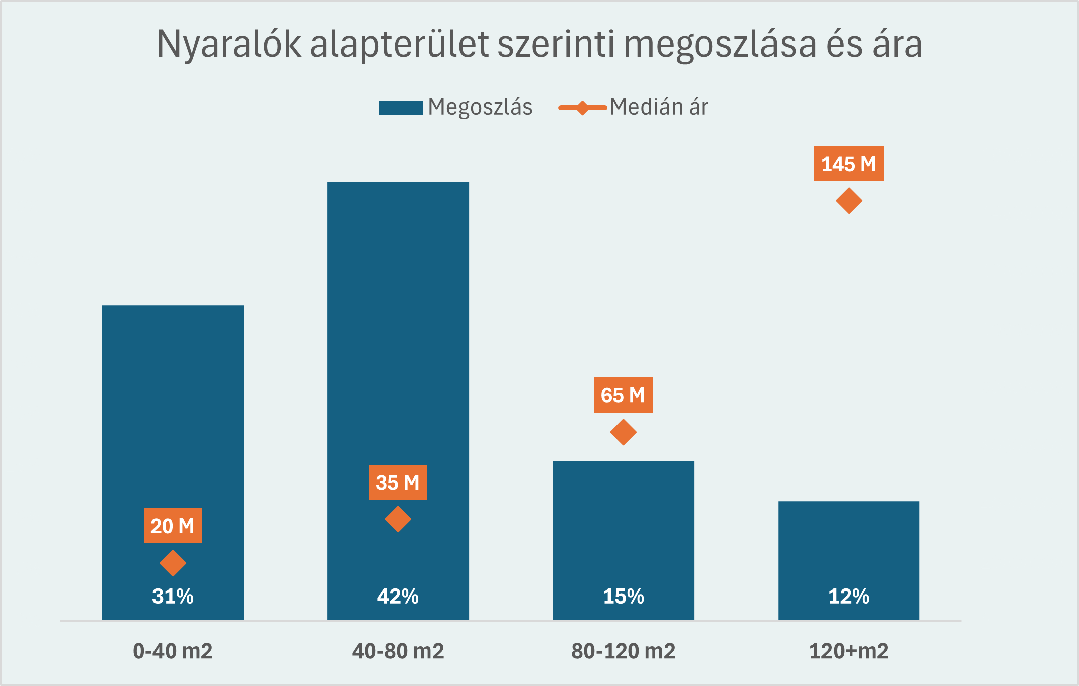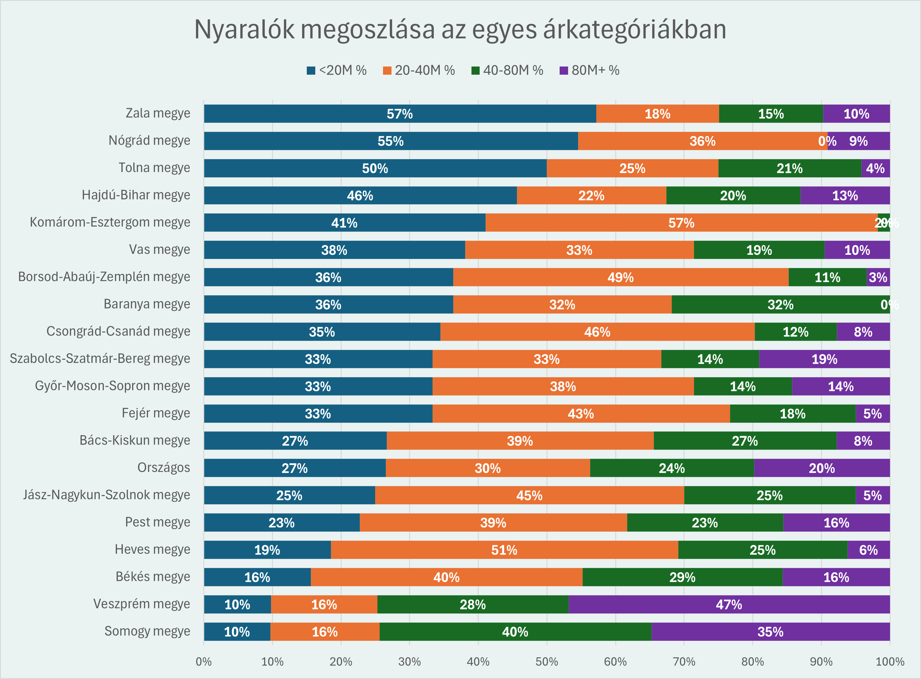 Az országos kép alapján a legtöbb nyaralót a 20-40 millió forintos árkategóriában hirdetik. Ez a sáv egyfajta „piacközép", ahol a kínálat a legsűrűbb. A 40-80 milliós tartomány 24 százalékos aránya azt jelzi, hogy a középprémium szegmens is élénk, míg a 20 millió alatti, jellemzően kisebb vagy felújítandó ingatlanok a kínálat 27 százalékát teszik ki.