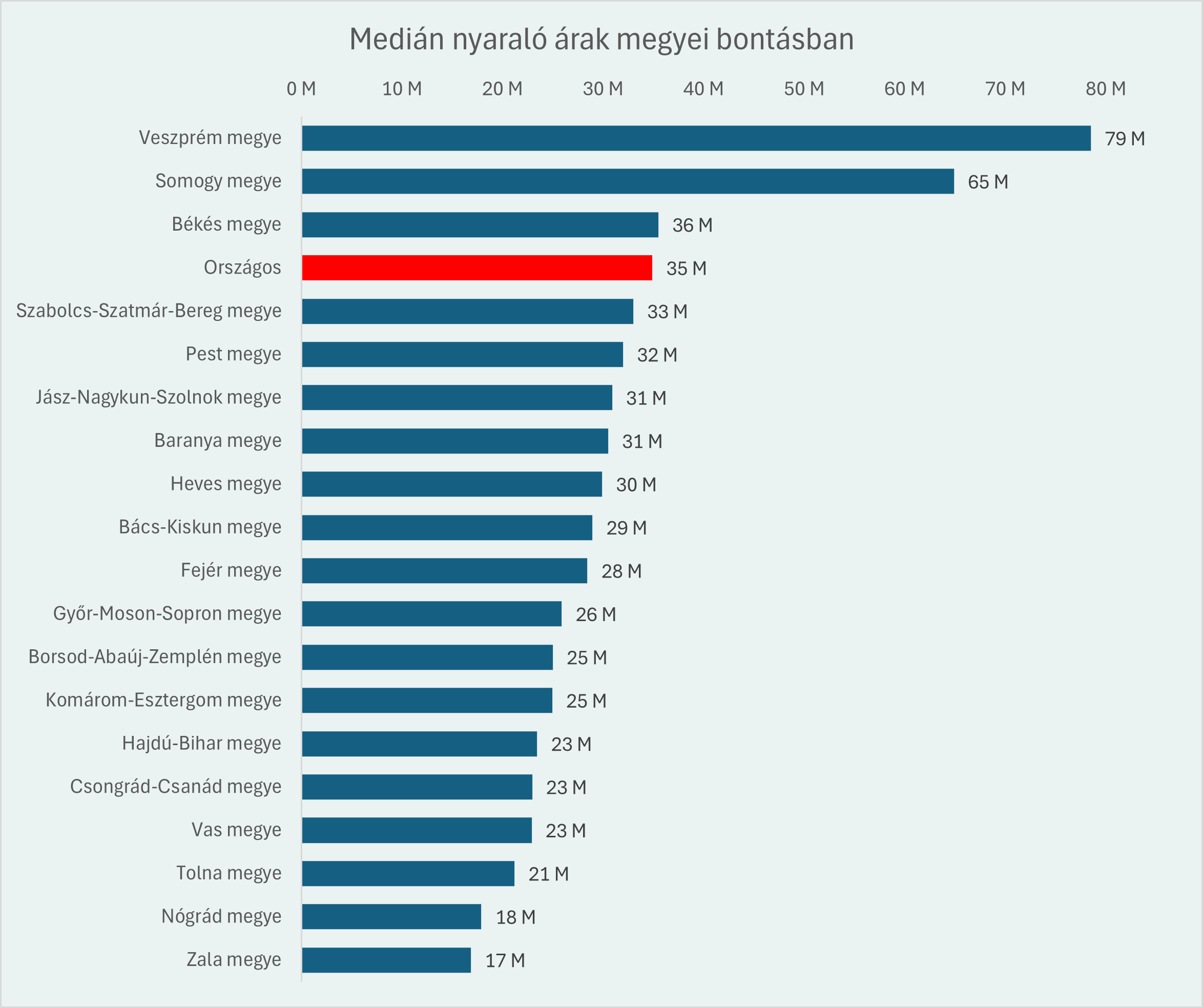 Az adatokból azonnal kiszúrható egy markáns jelenség: a Balaton mindent visz, a tó környéki árak messze kiemelkednek az országos átlagból. Veszprém megye vezeti a rangsort 79 millió forintos medián árral, Somogy megye 65 millióval a második. Ez nem meglepő, itt koncentrálódik a prémium nyaralóállomány, és a balatoni ingatlanpiac az elmúlt évtizedben bőven az országos átlag felett drágult.