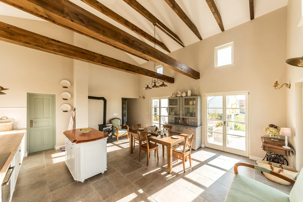 A belső kialakítás középpontjában egy nagy belmagasságú, gerendás konyha-étkező áll, amely természetes kőfelületekkel és karakteres konyhaszigettel adja meg a ház hangulatát. Innen nyílik a külön nappali, amely lehetőséget teremt arra, hogy a közös együttlétek és a nyugodt visszavonulás is jól elkülönülhessen.