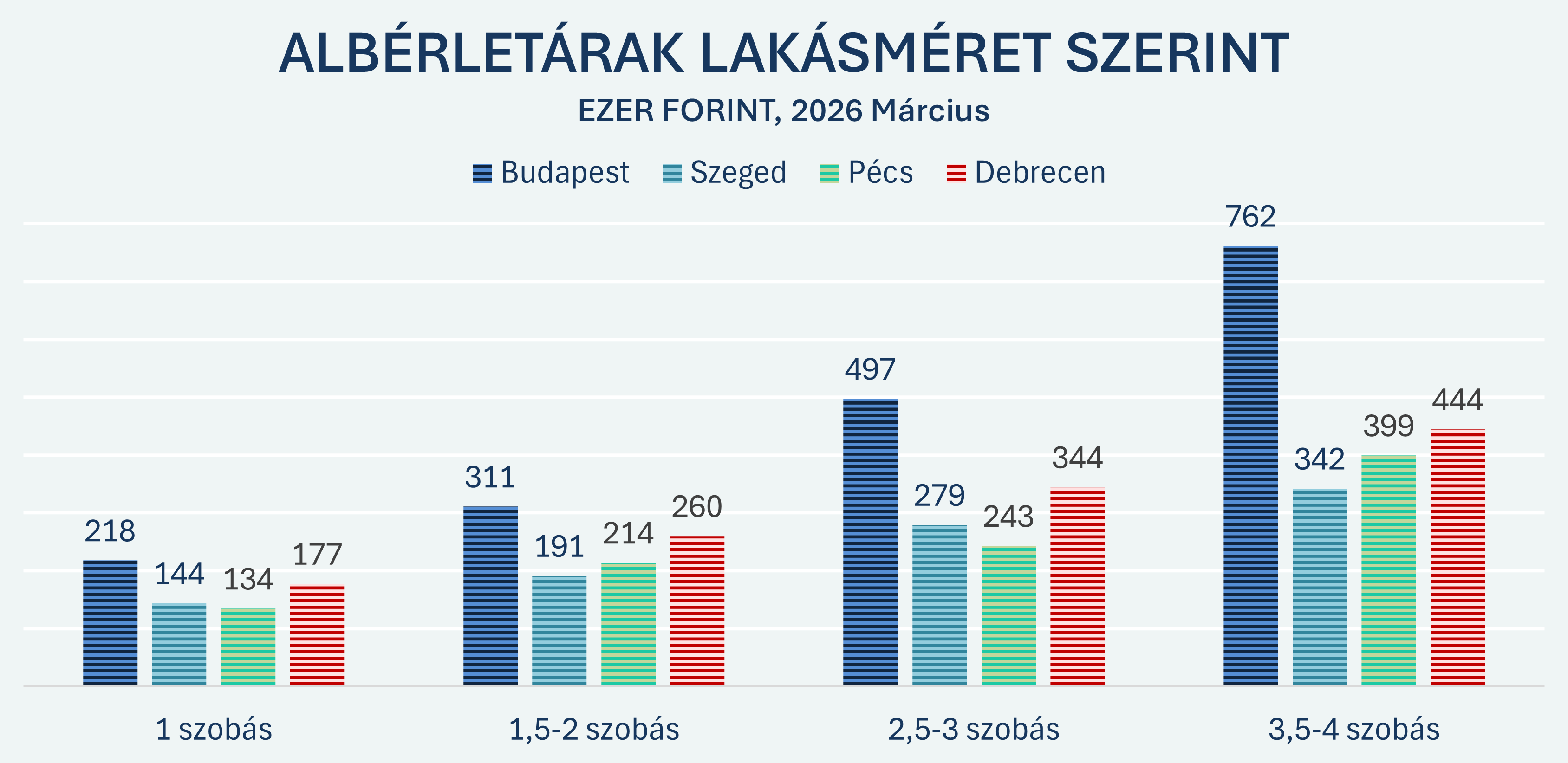 A vidéki egyetemi városok egy kicsit kedvezőbb képet mutatnak, Szegeden és Pécsett a mediánárak (210, illetve 200 ezer Ft) a nettó mediánbér nagyjából felét teszik ki. Debrecenben a medián albérletár (250 ezer Ft) a bér 58 százaléka.
