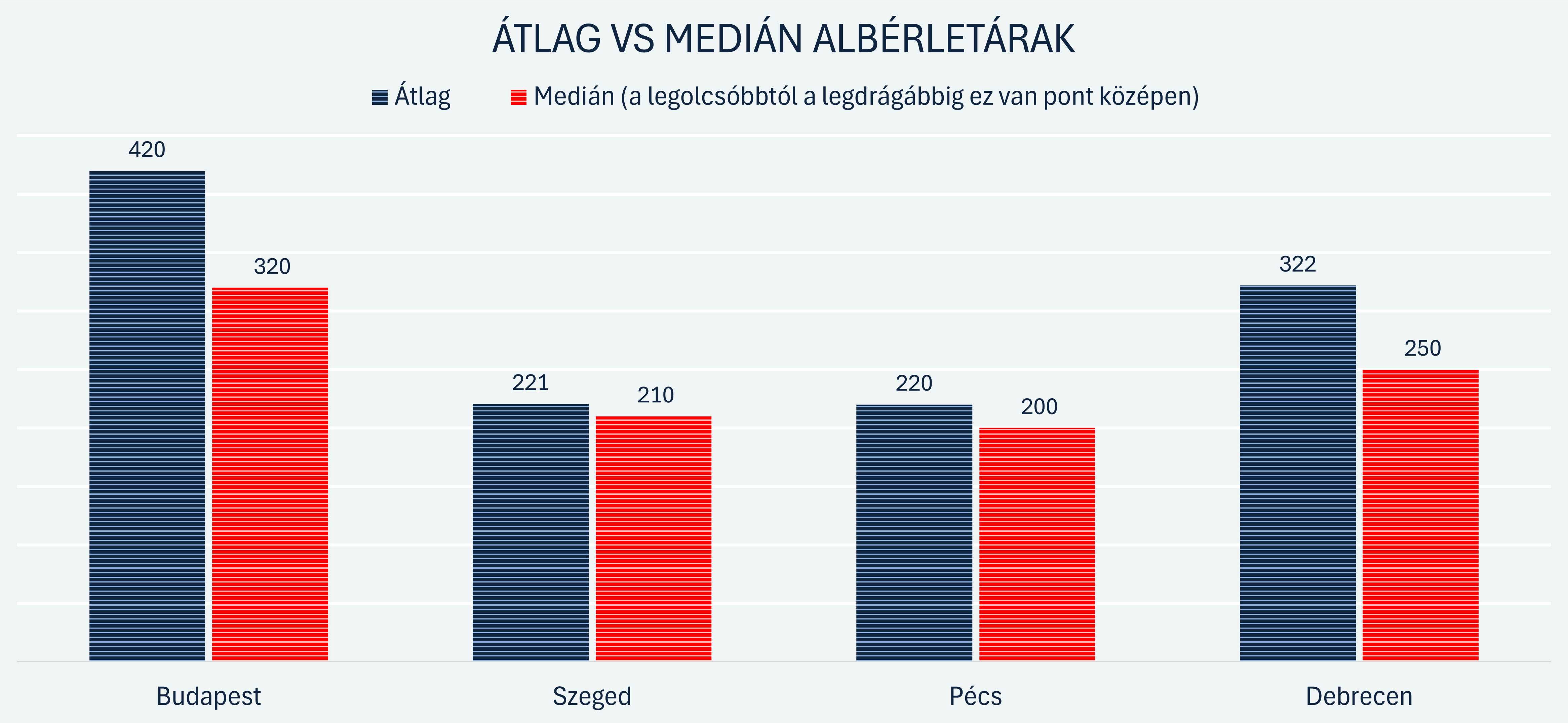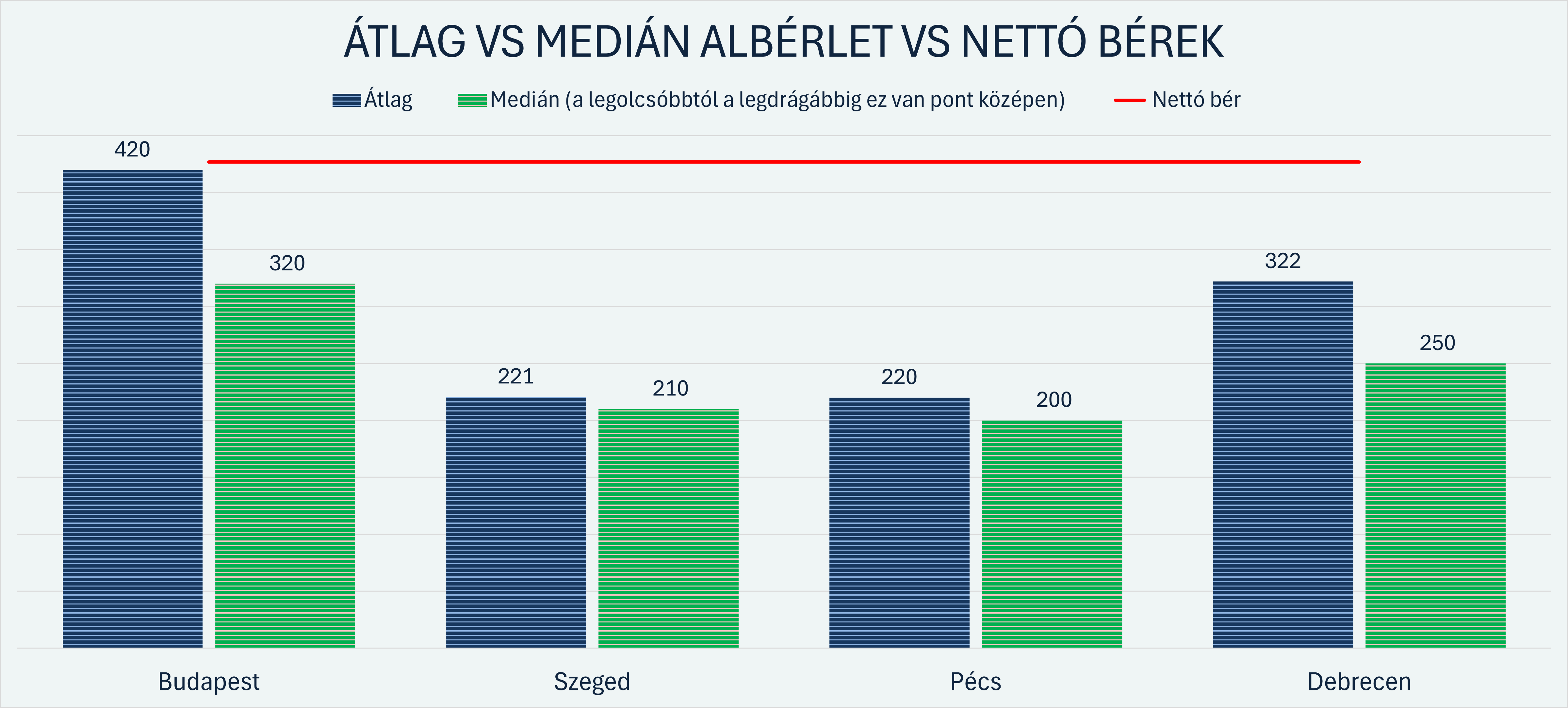 Az adatokból jól látszik, hogy a vidéki városoknál az átlag és a medián viszonylag közel áll egymáshoz: Szegeden nagyjából 5, Pécsett olyan 10 százalék körül van a különbség, itt valószínűleg kevesebb a szélsőség. Debrecenben már nagyobb a rés: az átlag (322 ezer Ft) és a medián (250 ezer Ft) között 72 ezer forintos, bő 20 százalékos eltérés mutatkozik.