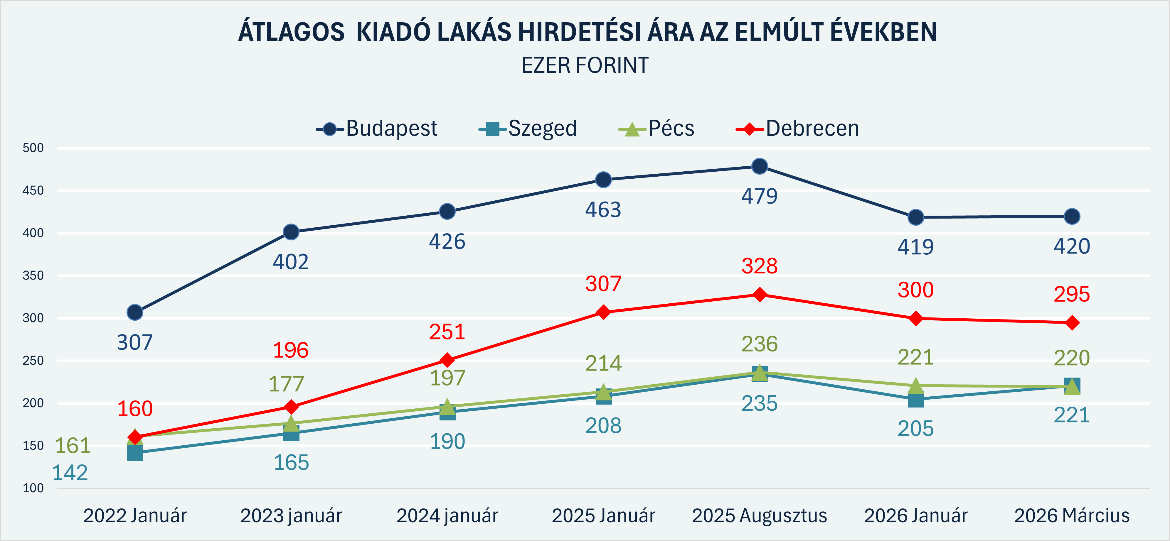 Hogy mindez hogyan rajzolódik ki a számok szintjén, azt jól mutatja az alábbi grafikon, amely a négy nagy egyetemi város átlagos kiadó lakás hirdetési árait követi nyomon 2022 elejétől: