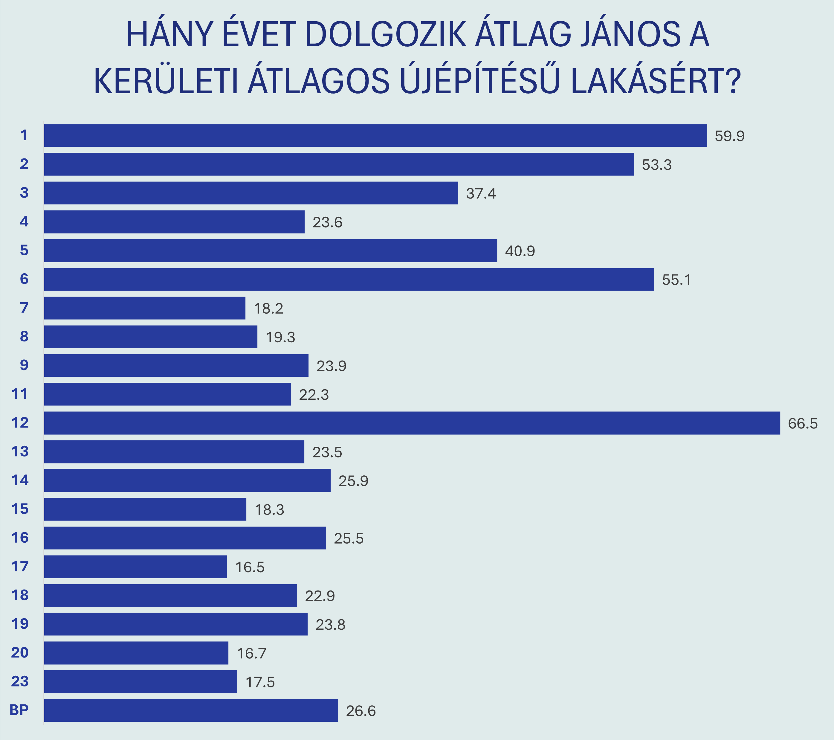 A kerületi különbségek azonban szédítőek. A legmegfizethetőbb kerületben, a XVII.-ben ez az időszak 16,5 évre rövidül - míg a XII. kerületben, ahol a négyzetméterárak a legmagasabbak, Átlag Jánosnak 66,5 évnyi fizetését kellene félretennie. Az I. kerület 59,9, a VI. kerület 55,1, a II. kerület 53,3 évvel szintén messze meghaladja egy átlagos munkavállalói életpálya hosszát.