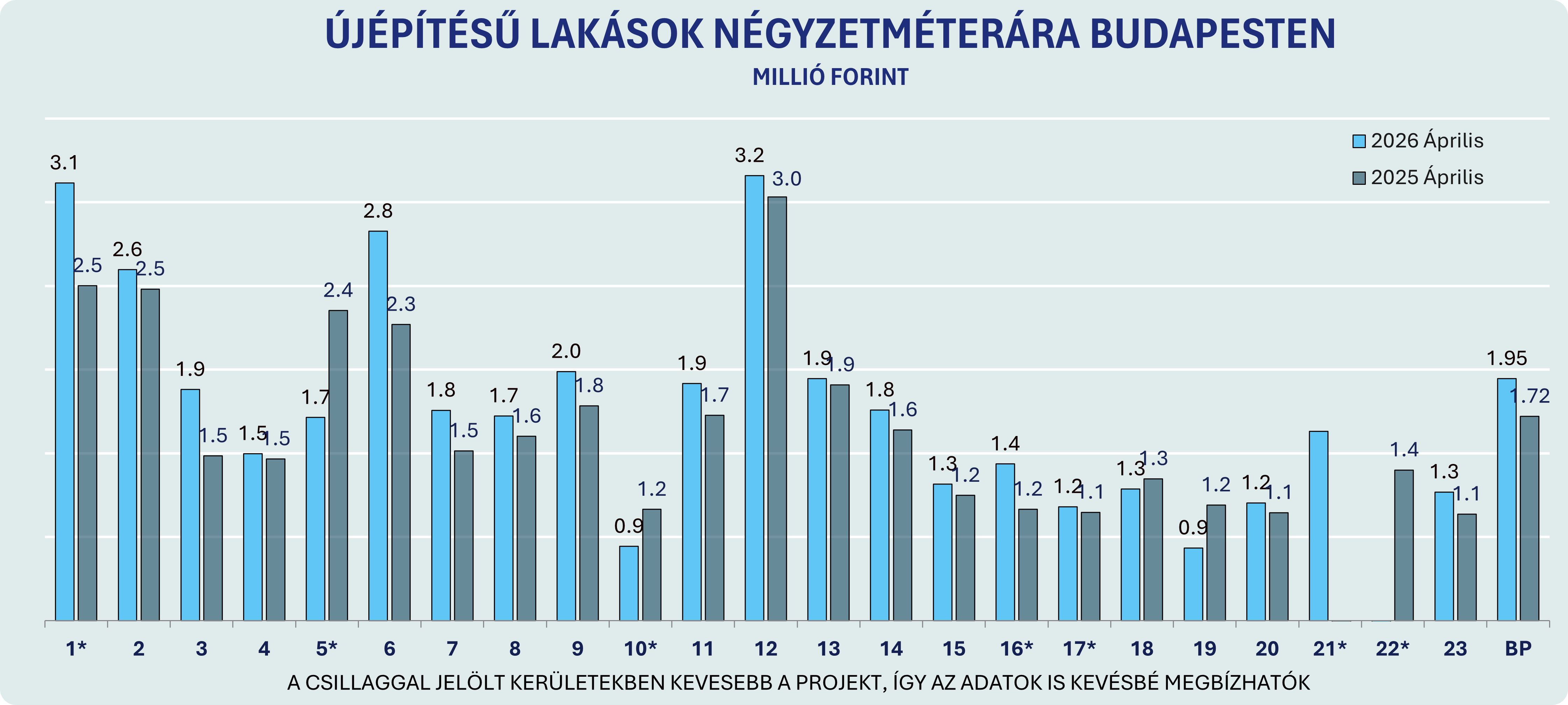 Áprilisban a budapesti újépítésű lakások átlagos négyzetméterára 1,95 millió forintra emelkedett, szemben a tavalyi 1,72 millió forinttal. A legdrágább kerületek dobogóján a XII. kerület áll 3,2 millió forintos négyzetméteráron, szorosan követi az I. kerület 3,1 millióval, de kiugró volt a drágulás Terézvárosban is, az Andrássy út környékének luxusberuházásai nyomán.