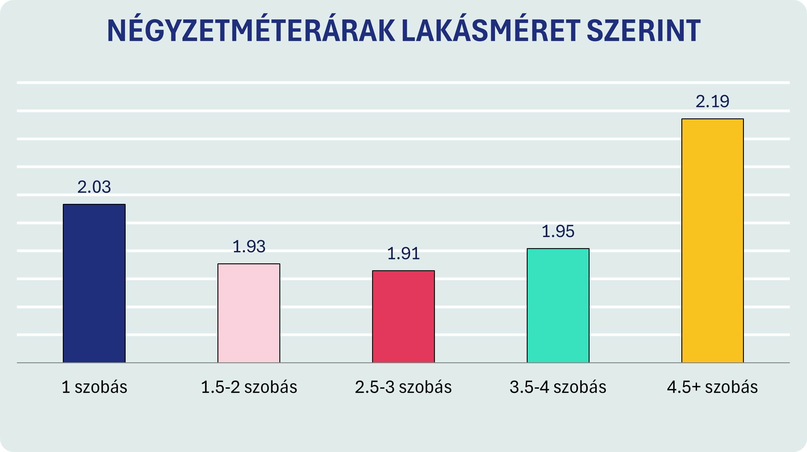A négyzetméterárak lakásméret szerinti bontása is tükrözi ezt a dinamikát, a kínálat javát adó lakásméretek átlagos négyzetméterára hajszálnyival alacsonyabb, míg a legkisebb és legnagyobb lakások átlagos négyzetméterára némileg magasabb.
