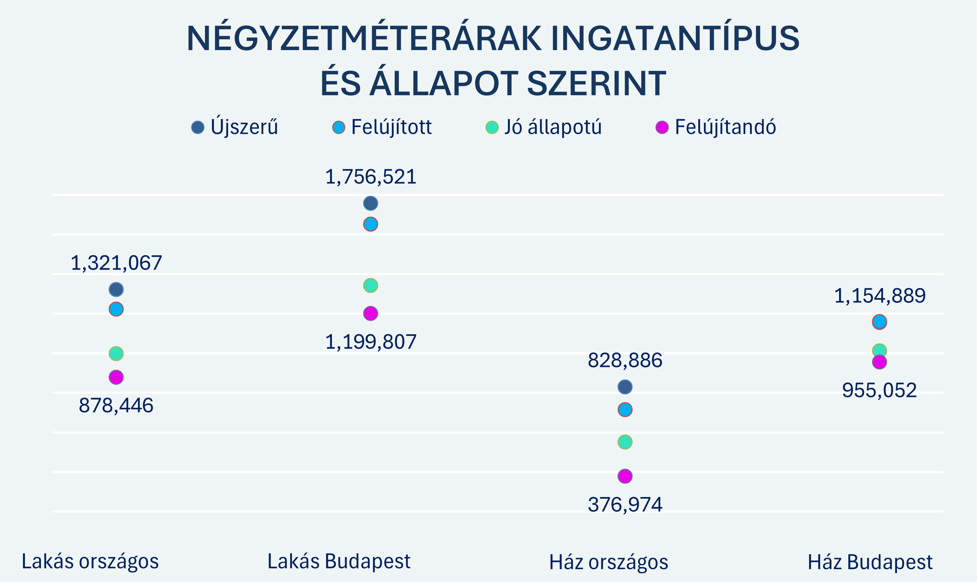 Továbbra is az újszerű ingatlanok vezetik a mezőnyt, ahol az átlagos négyzetméterár már átlépte az egymillió forintos szintet. A felújított lakások és házak szintén közel kerültek ehhez a lélektani határhoz, ami azt mutatja, hogy a jó minőségű, azonnal költözhető ingatlanok iránt erős a kereslet.