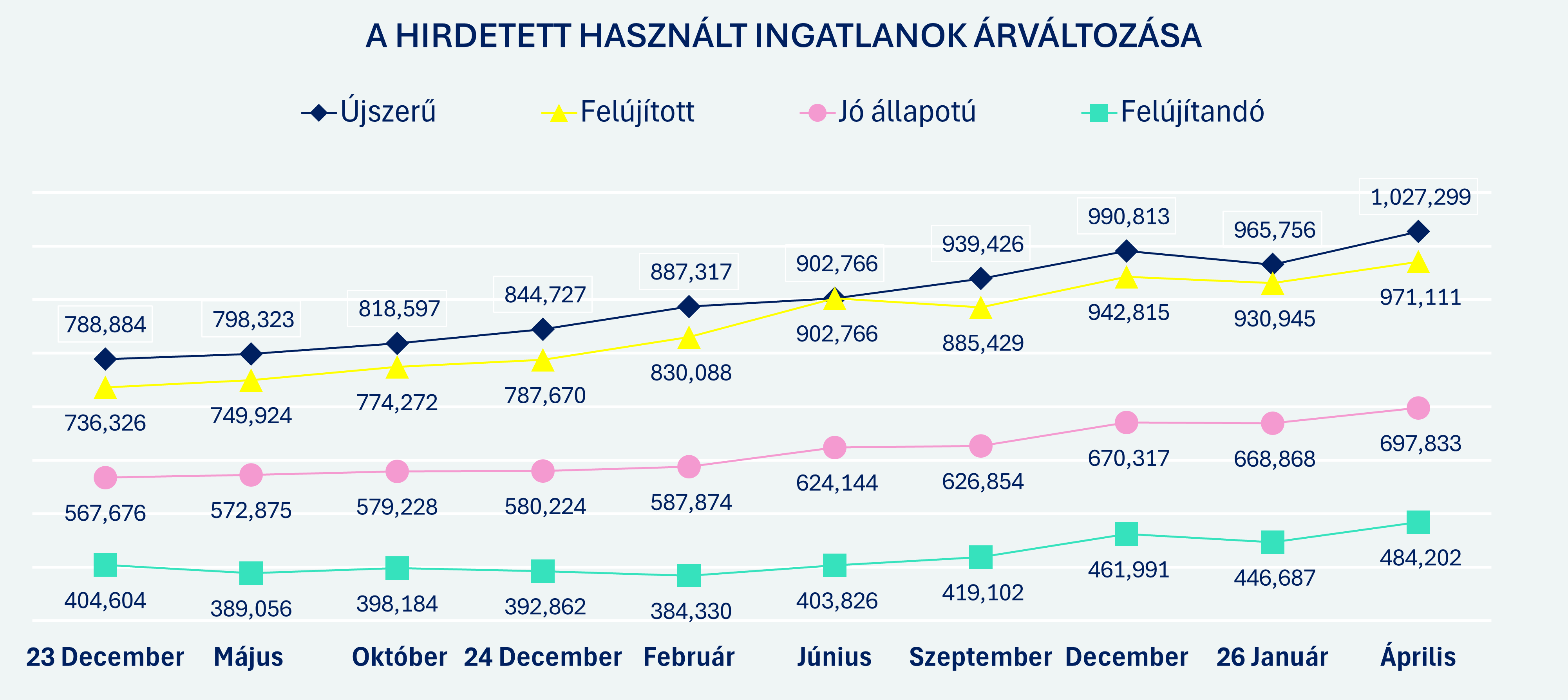A friss adatok alapján ugyan még korai lenne egyértelmű fordulatról beszélni, de több mutató is arra utal, hogy a piac kiléphetett a téli- tavaszi rosszkedvű időszakból, és áprilisra minden állapot kategóriában emelkedtek az átlagos négyzetméterárak.